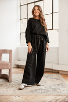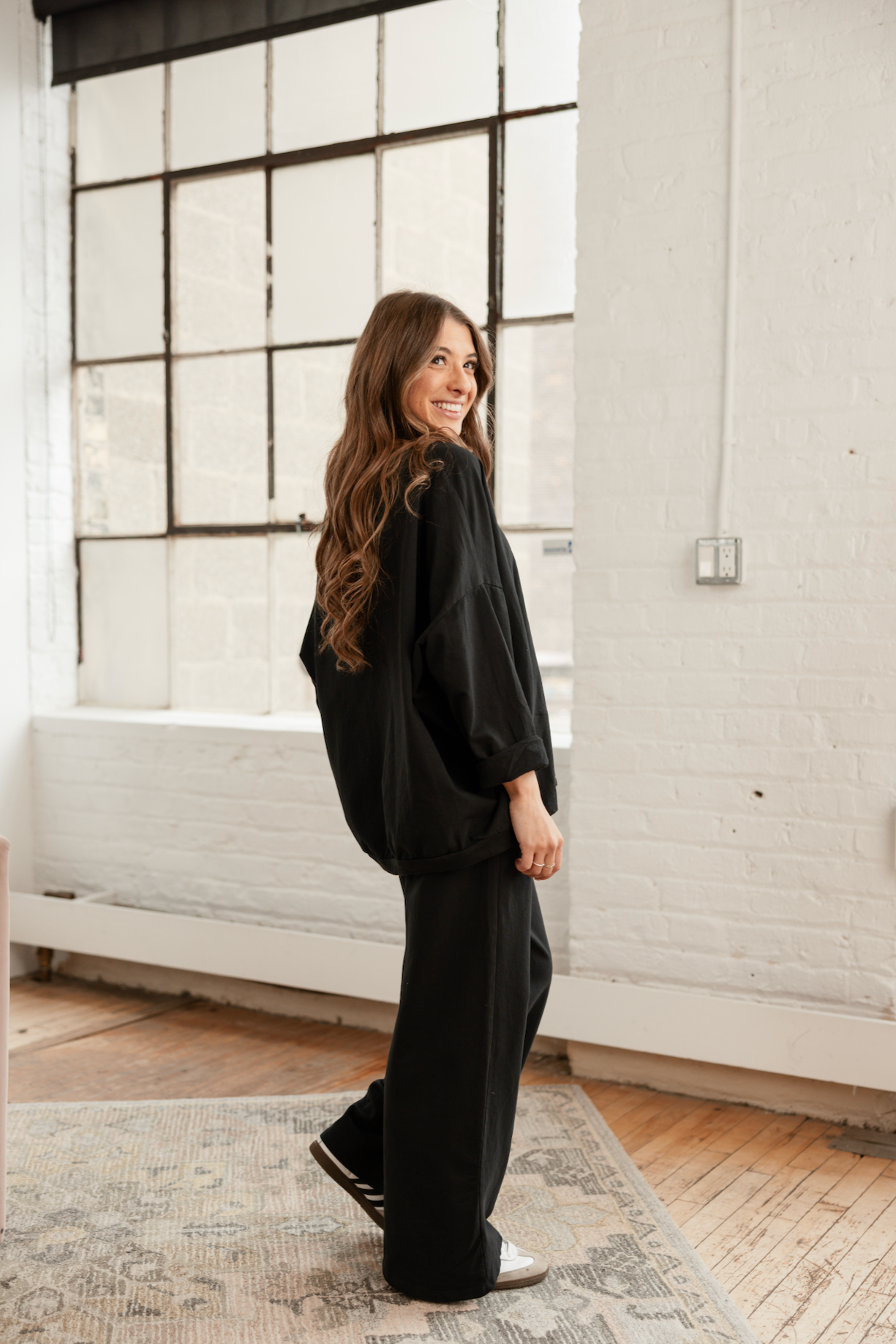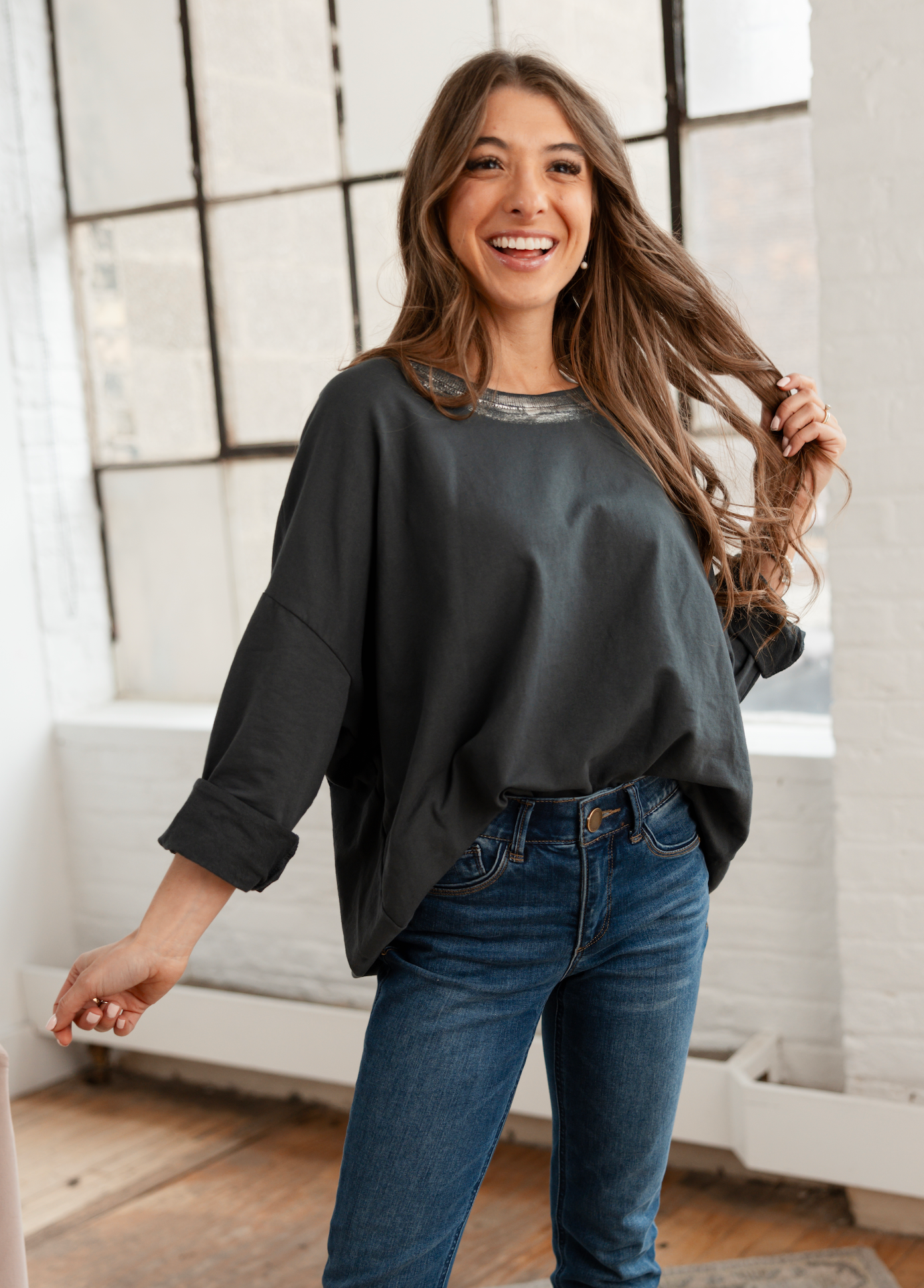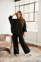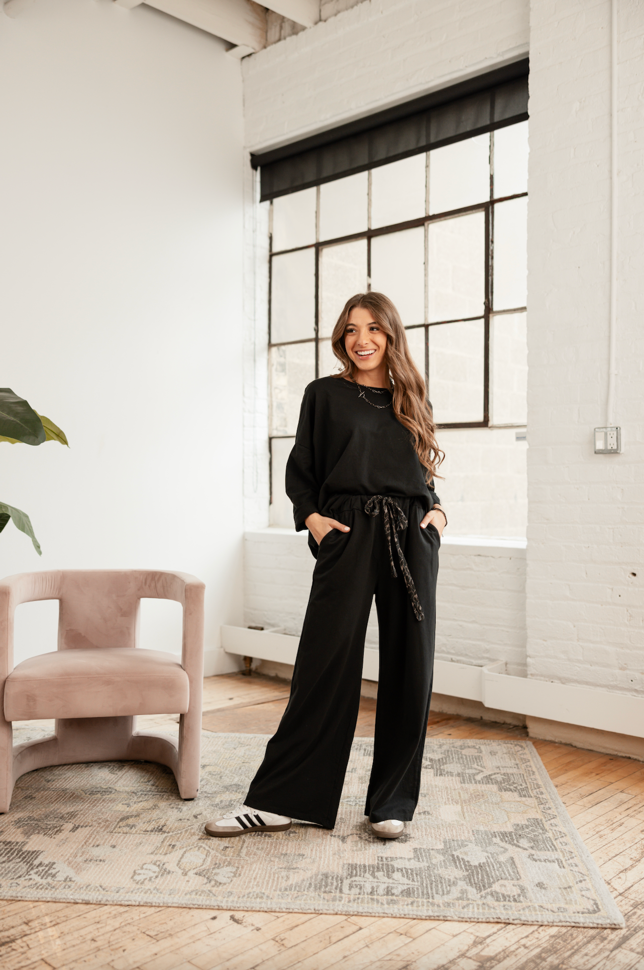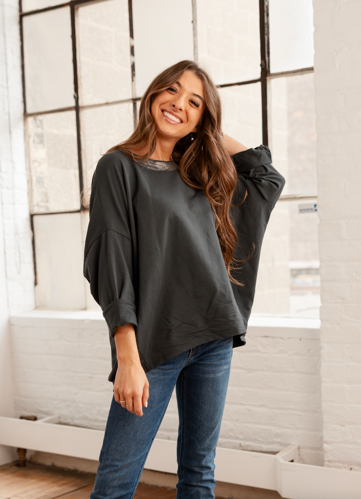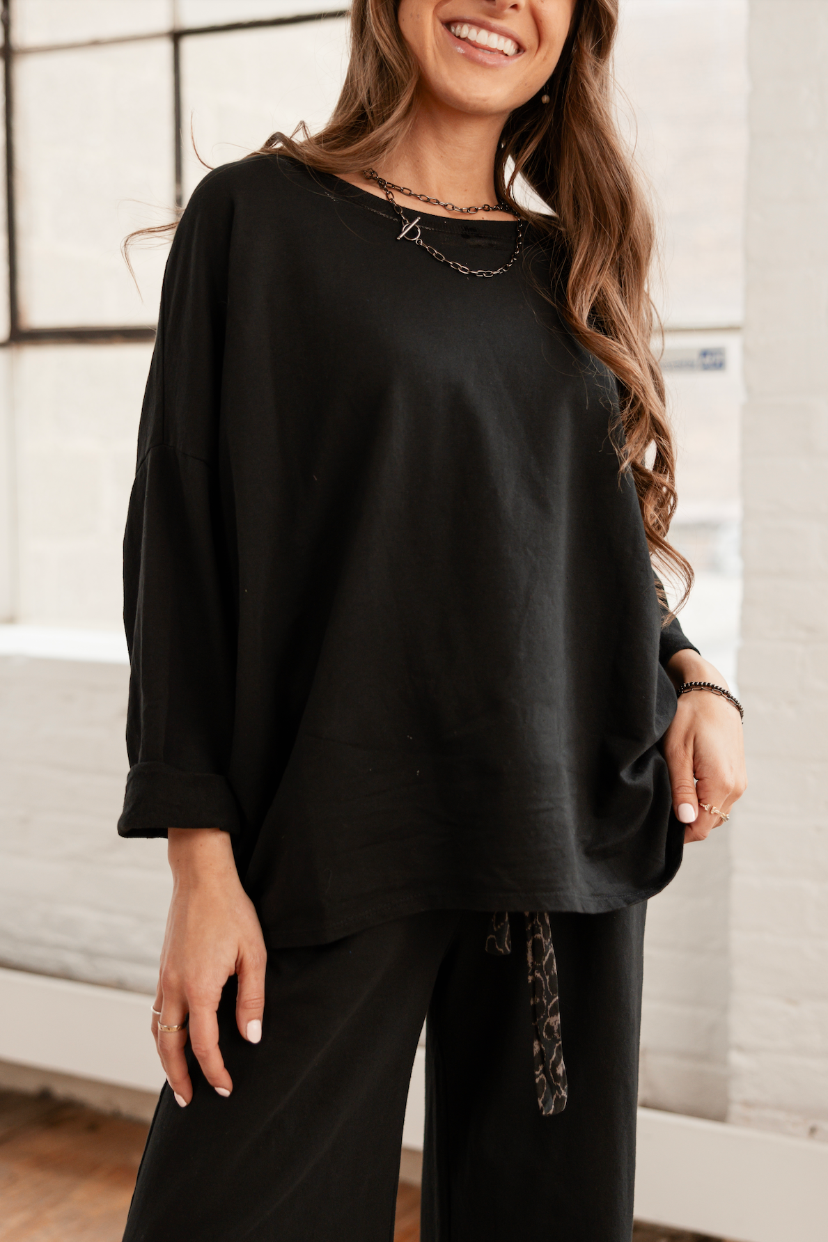 Effortlessly stylish, incredibly comfortable. Our Italian Jet Setter Flowy Top is ready for all your adventures - whether that means across the world or simply to the grocery store. Featuring monochromatic black paint around the neckline for a chefs kiss flare, this top goes great back to the Italian Jet Setter Flowy Pants!