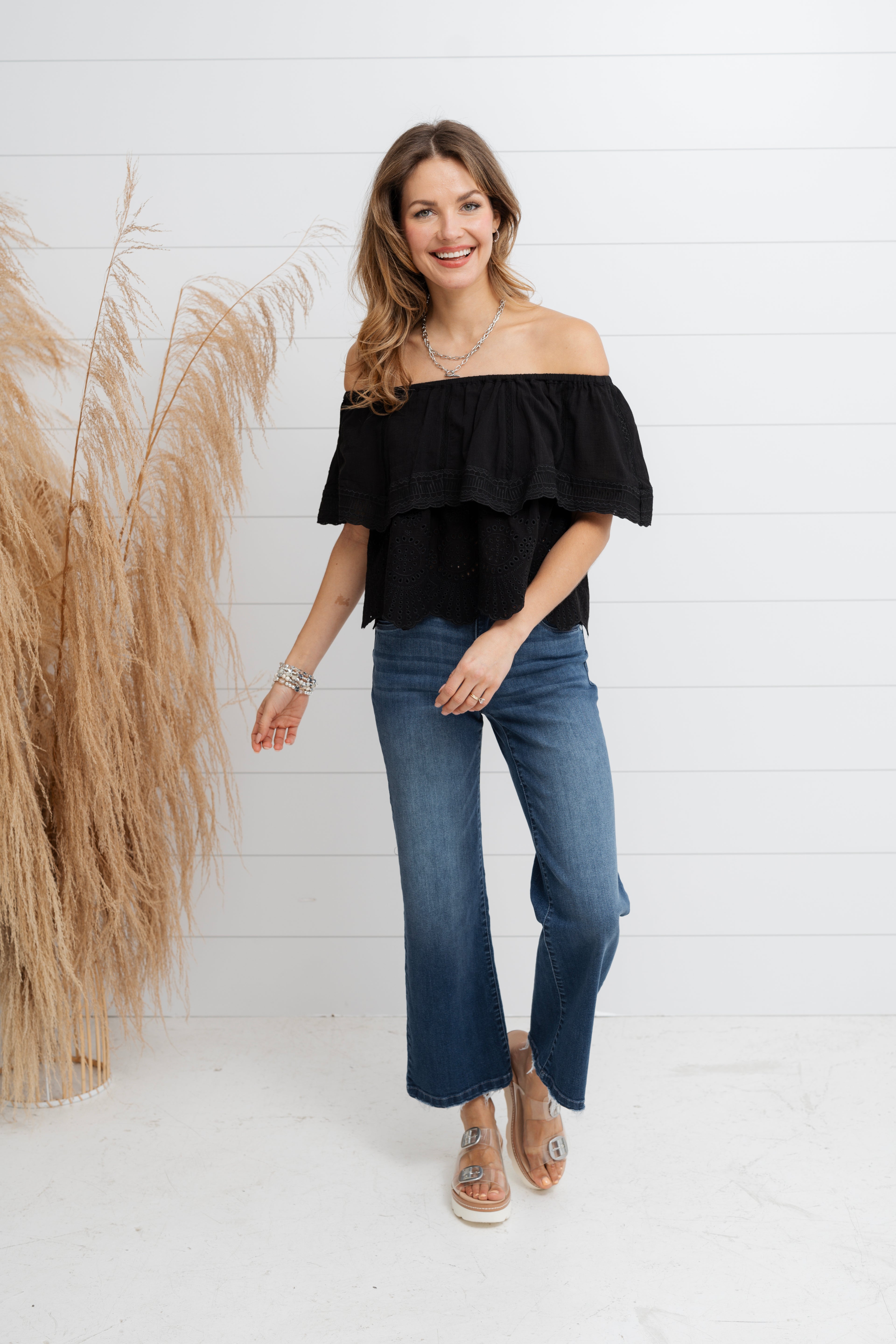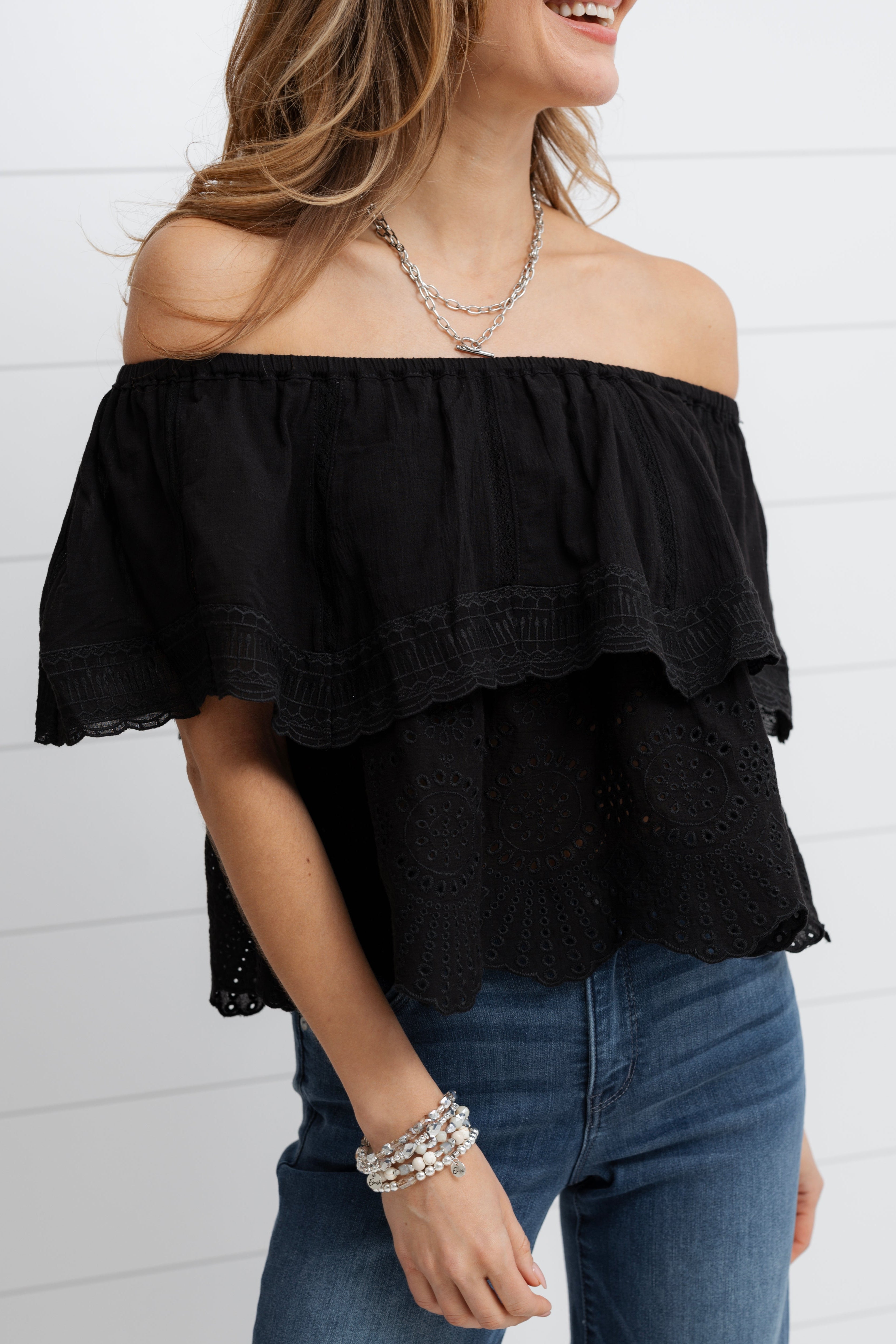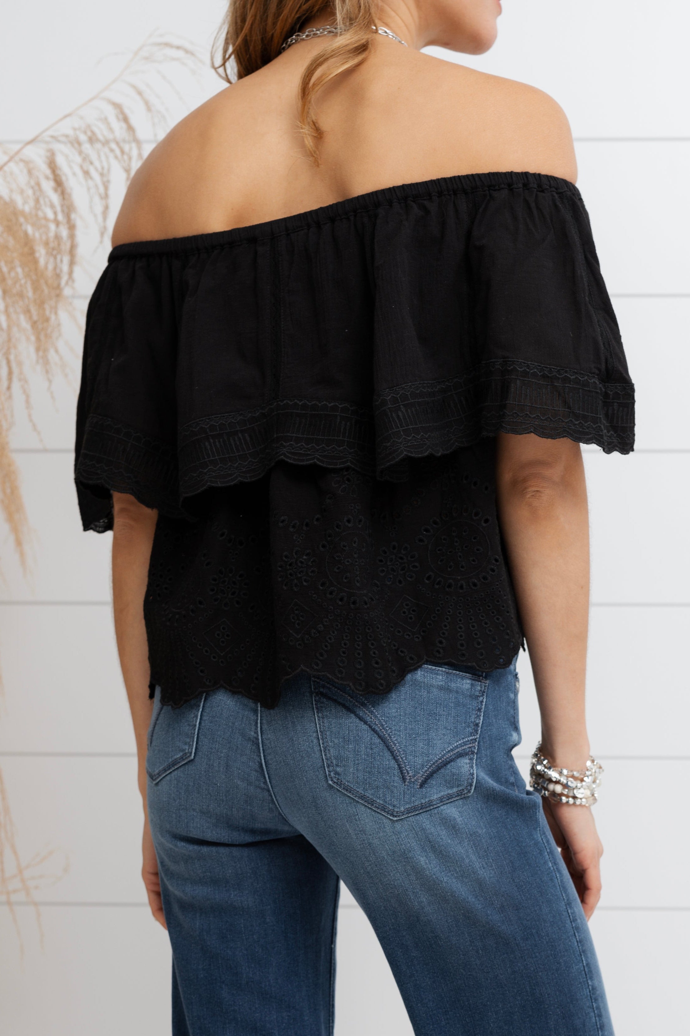 Crafted with lightweight cotton gauze and eyelet embroidery, this off-the-shoulder top brings the perfect mix of laid-back and polished. The ruffle overlay adds a feminine touch, while the scalloped hem and intricate detail make it a standout piece—with zero effort required.