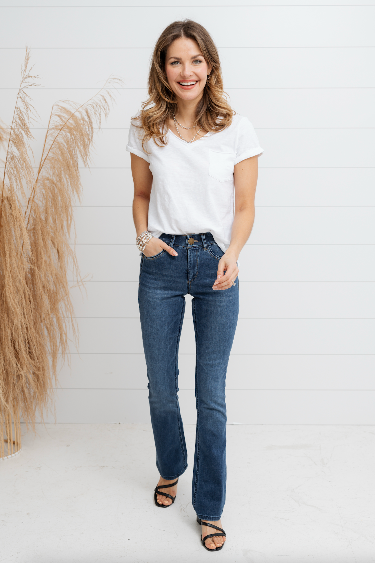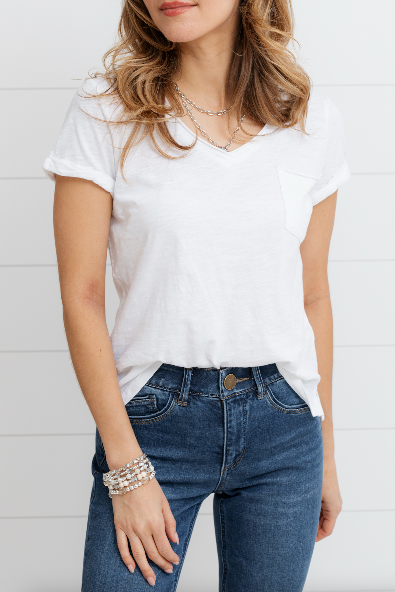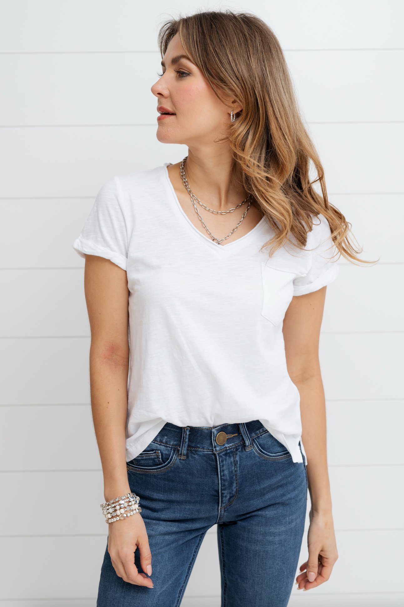 That classic v-neck top, with the "just right" lived-in vintage feel. The sleeves feature double roll cuffs, and the pocket is the idea size for visual flattery. Our V-neckline is flattering on all shapes and sizes, and has a subtle roll detail to add dimension framing your face. Wear her alone, or layer her under your favorite jacket -- either way, this gorgeous color is going to make you shine!