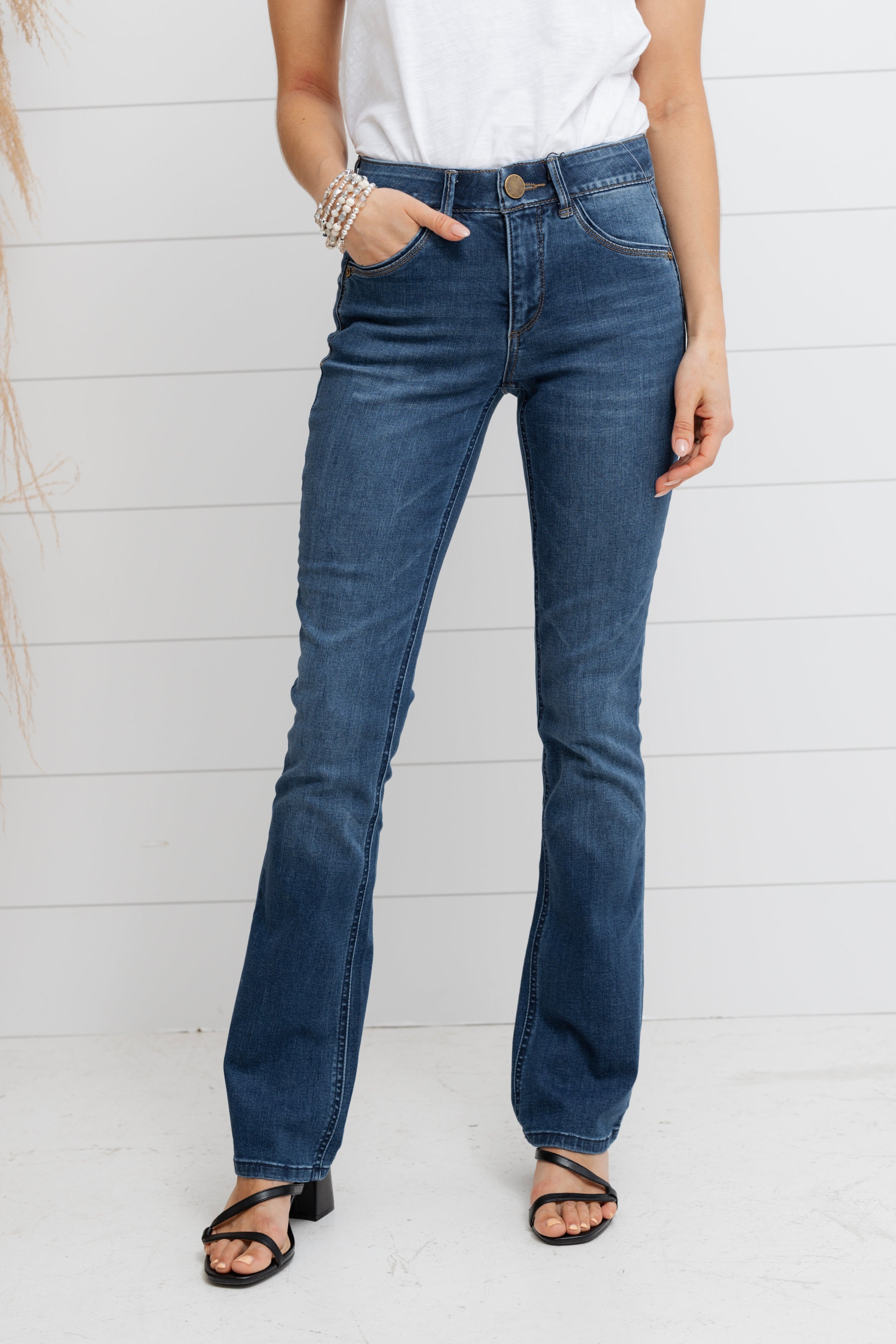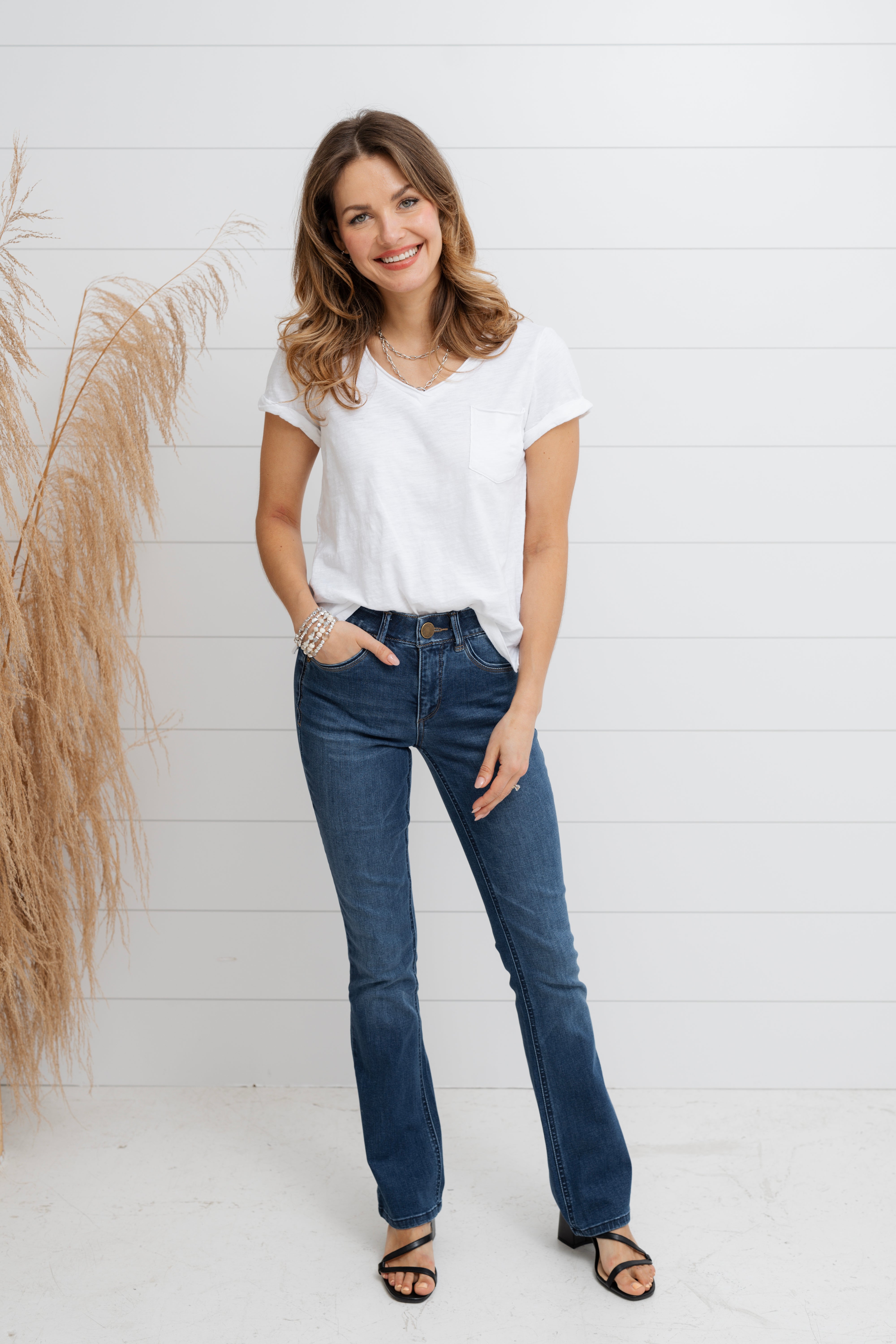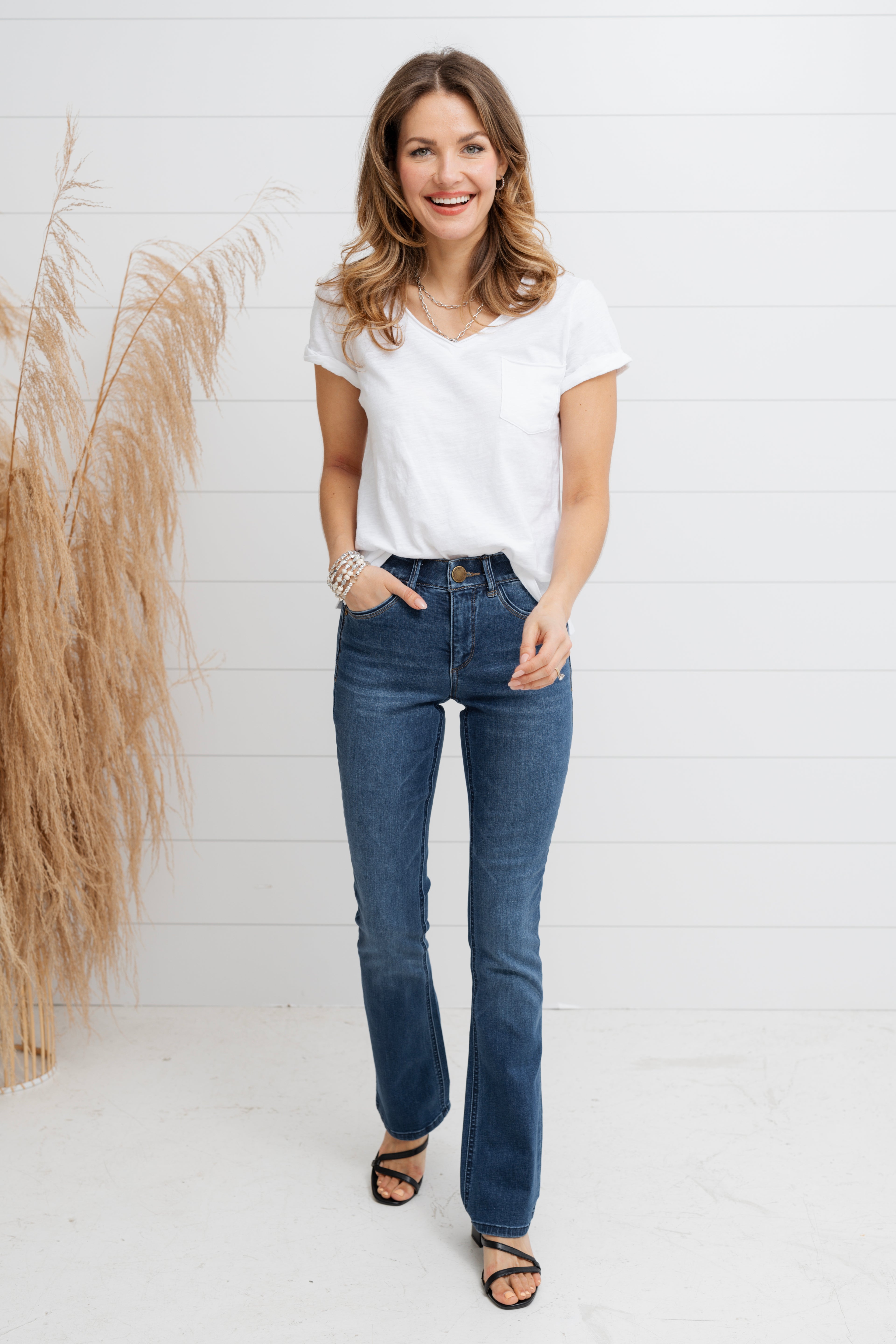 Crafted with a soft, stretchy denim blend, these everyday flares hug in all the right places and finish with a subtle itty bitty bootcut flare. The high rise gives you that legs-for-days look while still keeping things comfy and wearable all day long.
