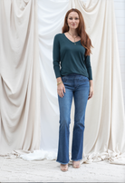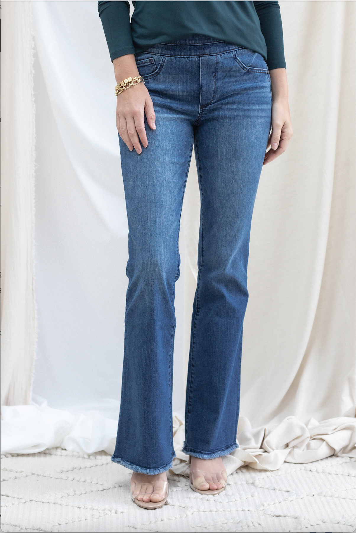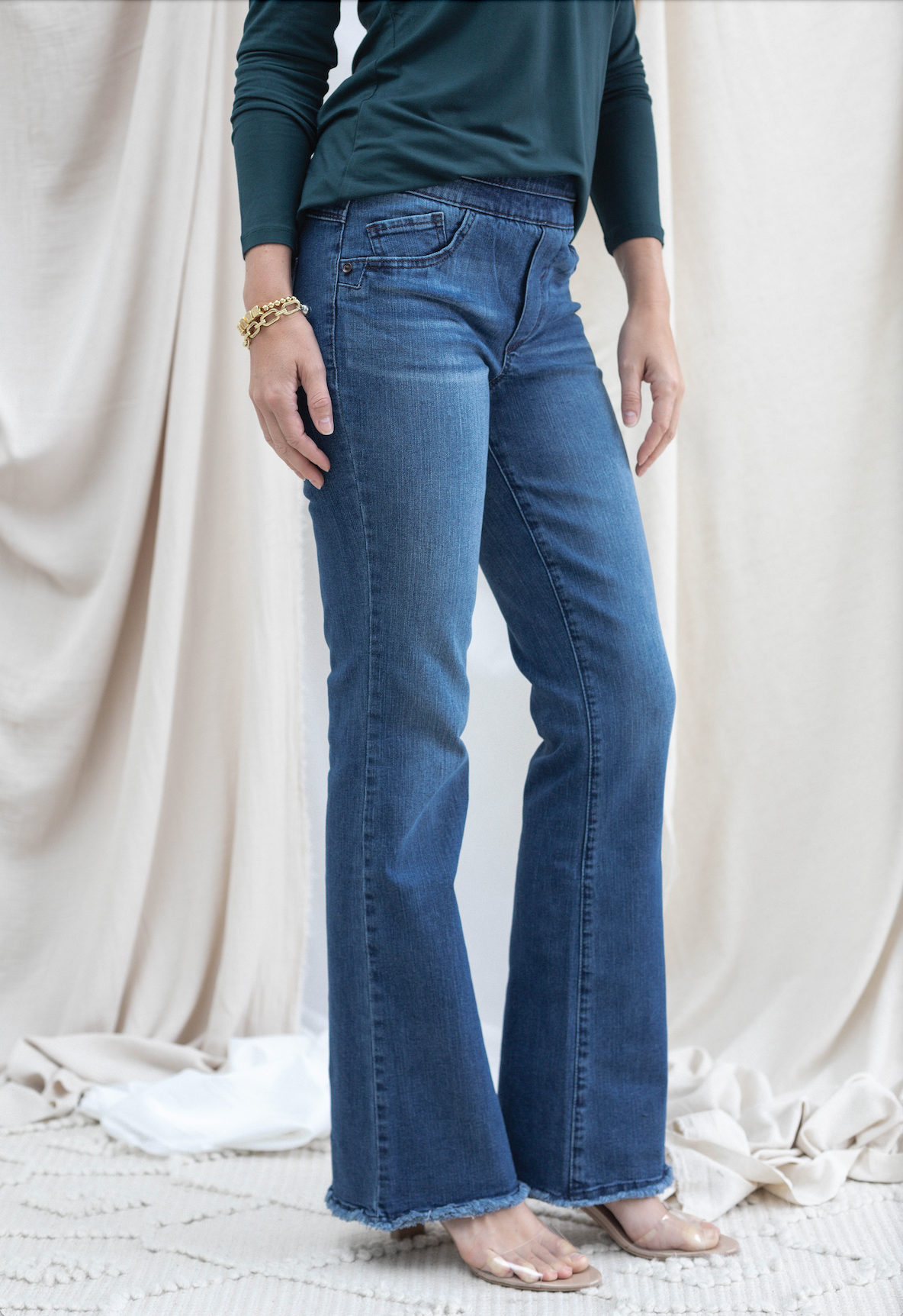 This sleek pair of Mac and Me's have a fray bottom and versatile wash. This glider features a double layer of reinforcement around the waist, with faux front pockets and real back pockets - details that are extra-flattering whether you want to tuck in your shirt or wear it out! It does not have any destruction, making it the perfect pair from professional environments to date night.