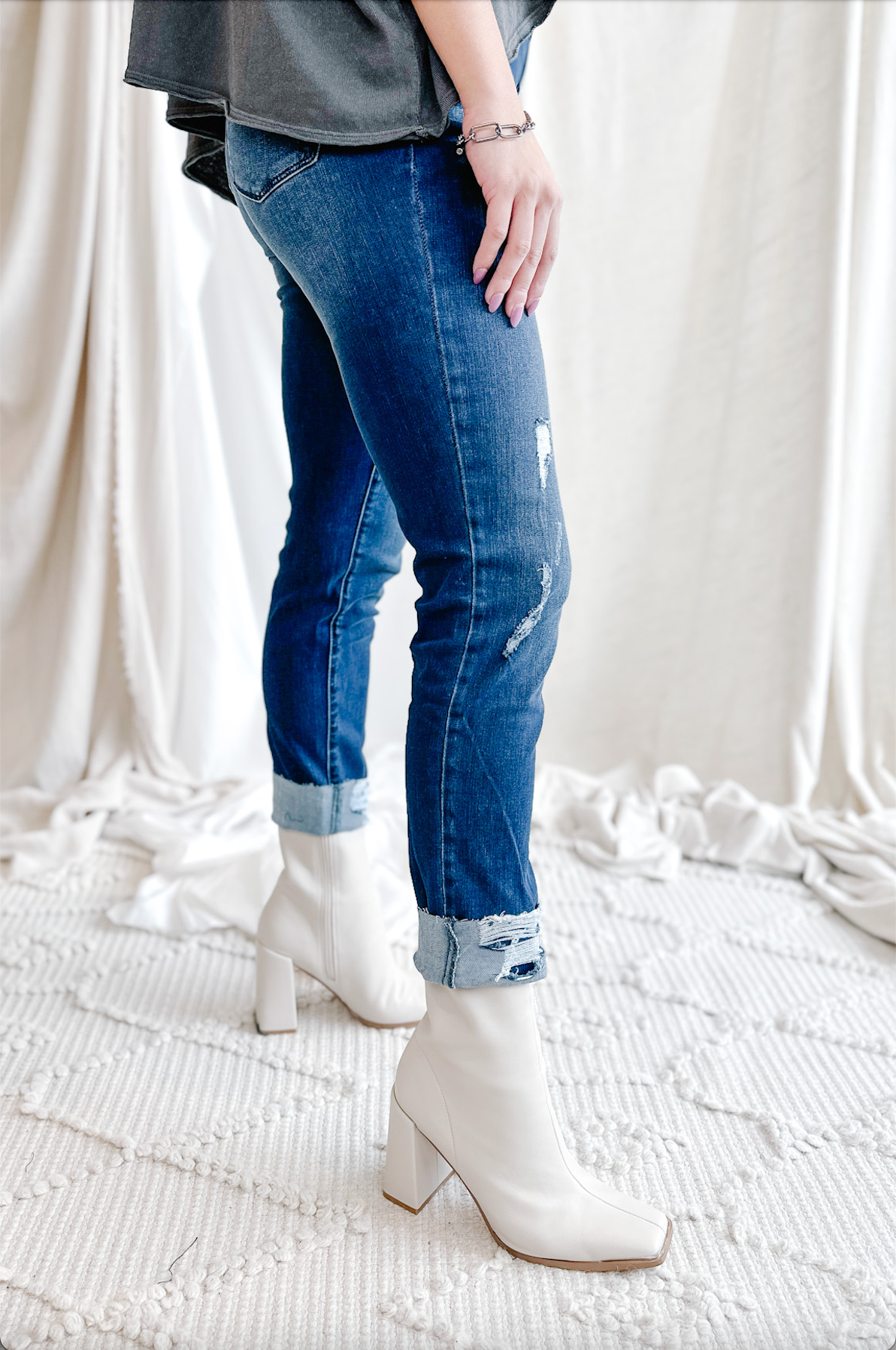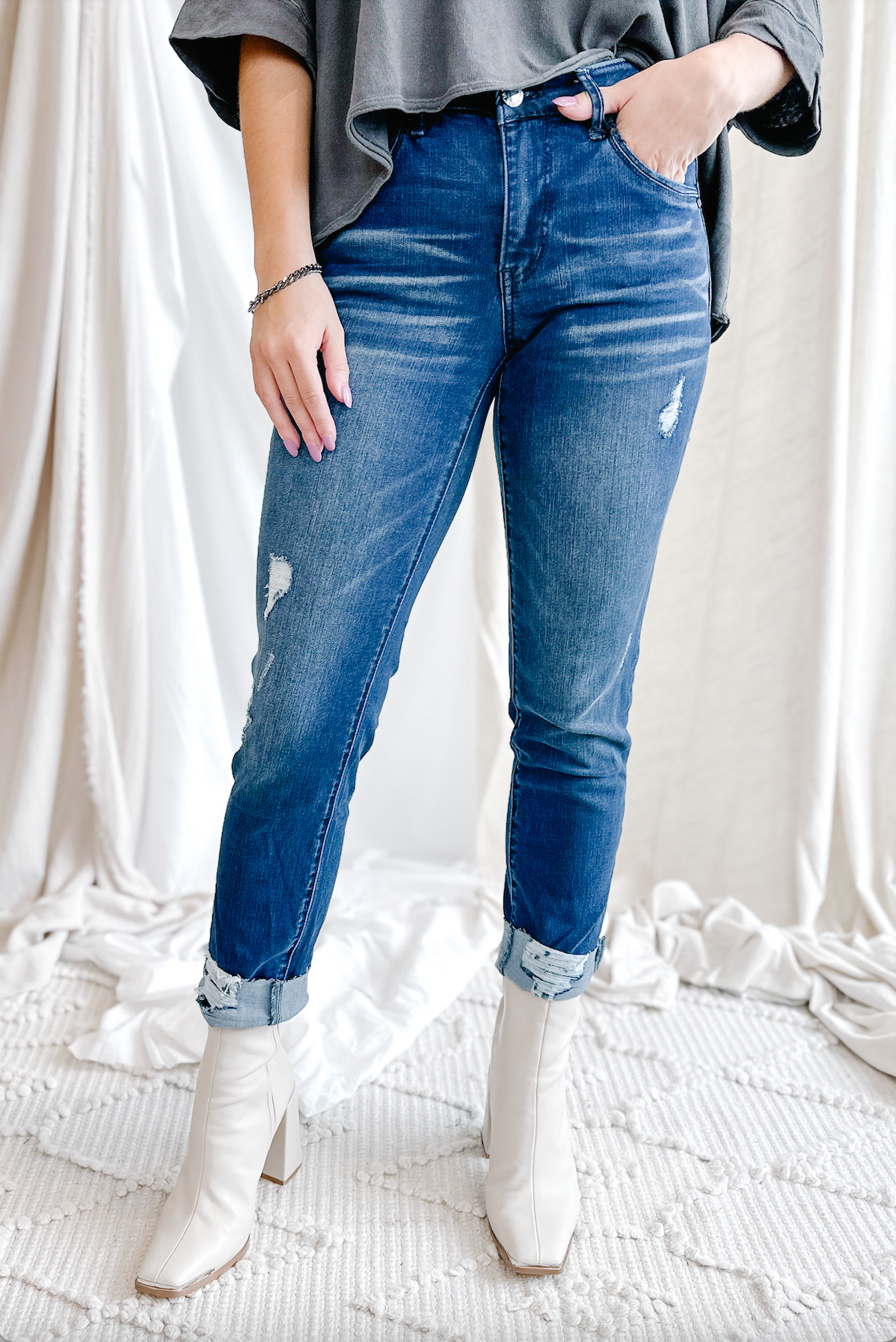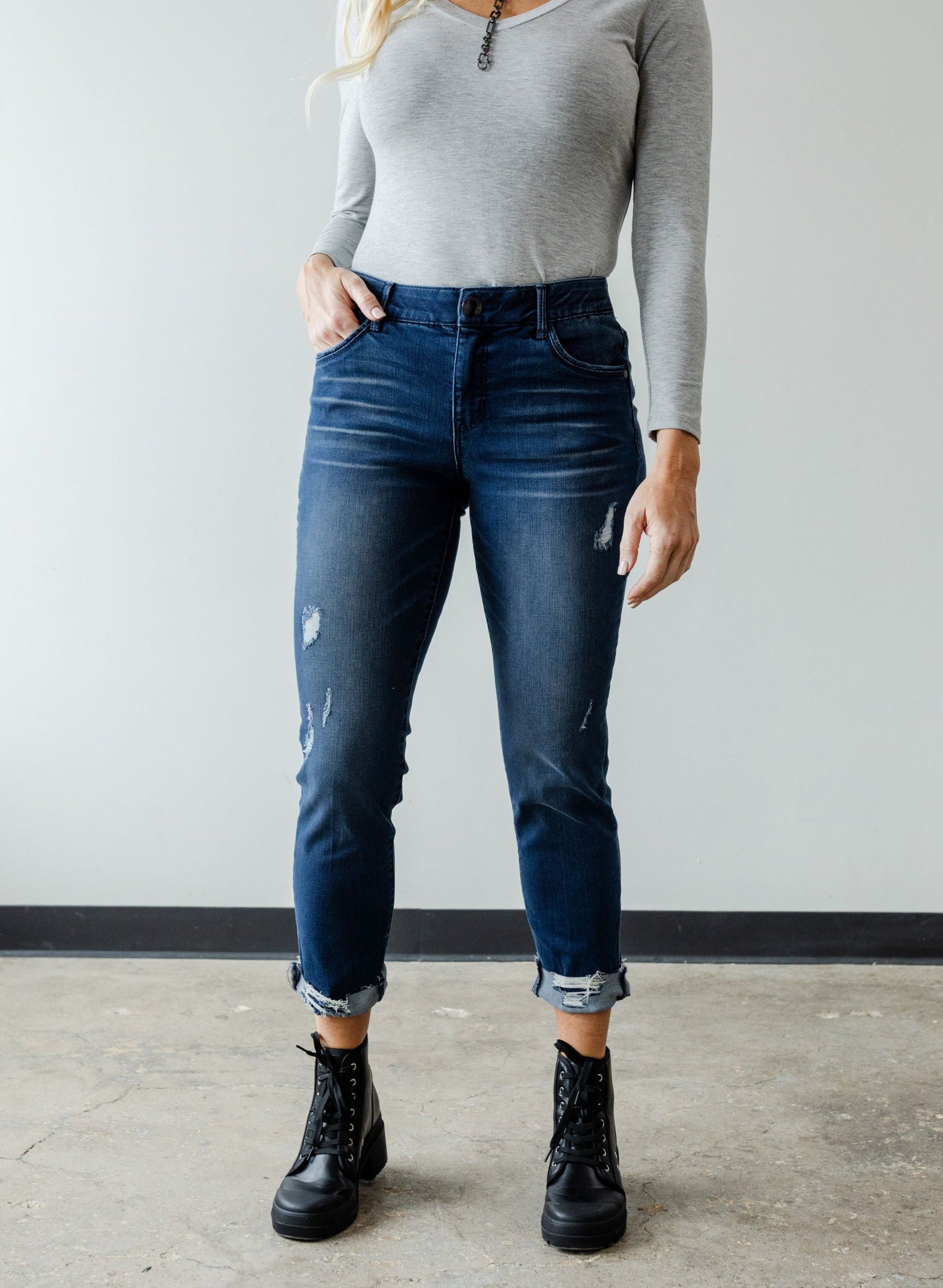 Think: Edgy, yet sleek. Destructed, yet sophisticated. Girlfriend, yet flatters your shape. Composed of our famous Mac and Me buttery soft material, this jean will bring you from day to night, and everything in-between!