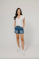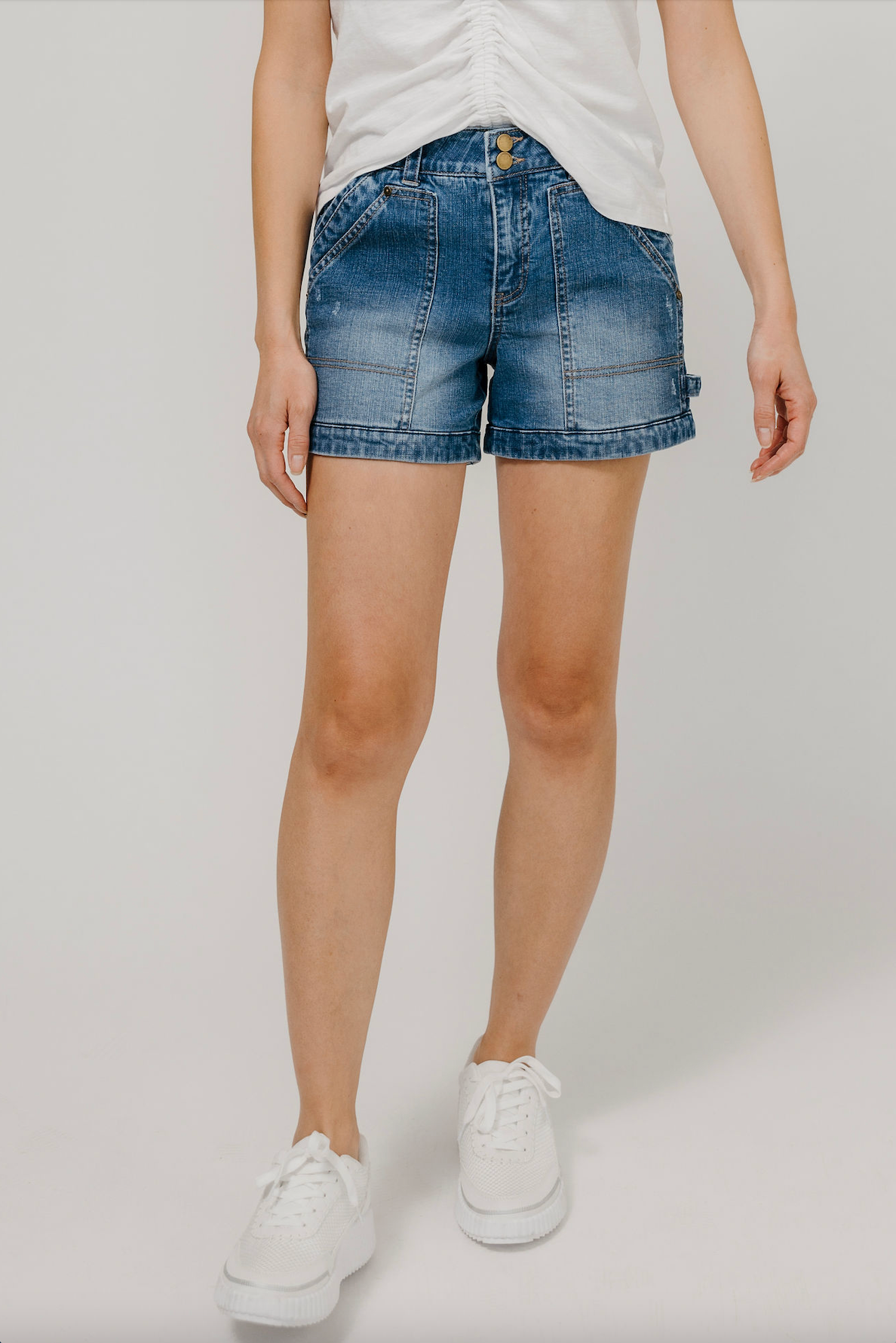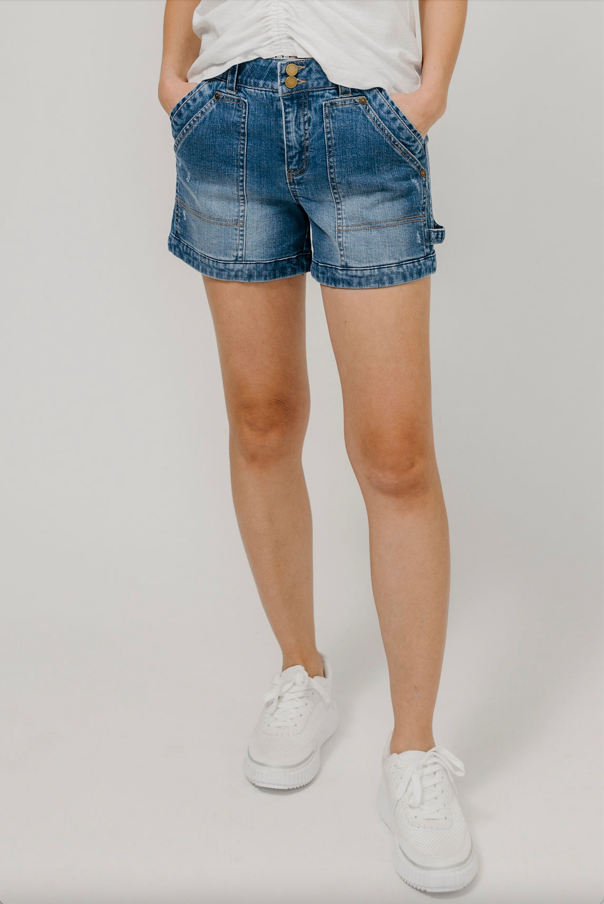 Embrace the warm weather with our High Rise Double Button Carpenter Shorts. Crafted to offer both style and comfort, these shorts are a summer wardrobe must-have. The high-rise waist, secured with a double-button closure, ensures a flattering fit that accentuates your silhouette, while the durable denim provides lasting wear through all your summer adventures.