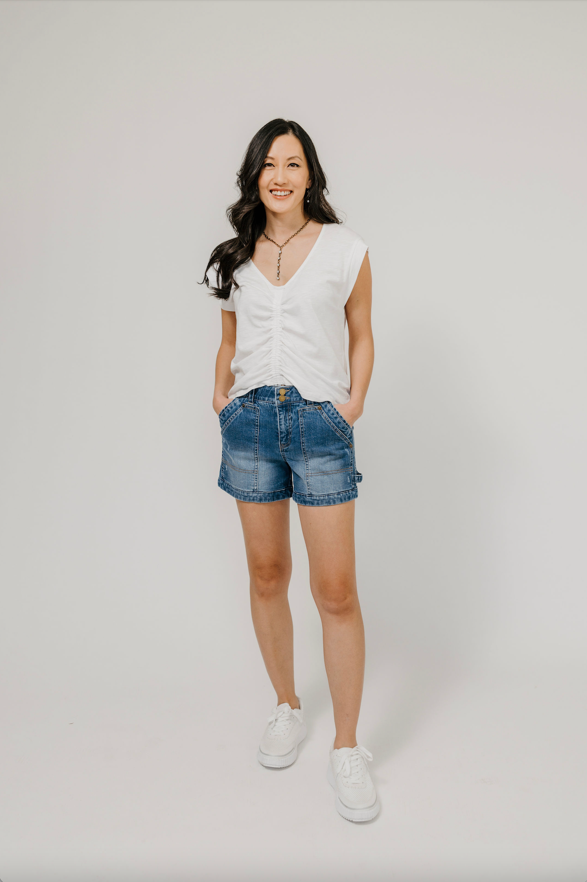 Available in a classic blue denim wash, the Mac and Me Carpenter Shorts pair effortlessly with everything from simple tees to breezy blouses, making them the perfect addition to your casual summer collection.
