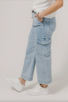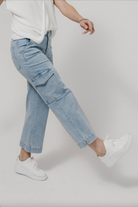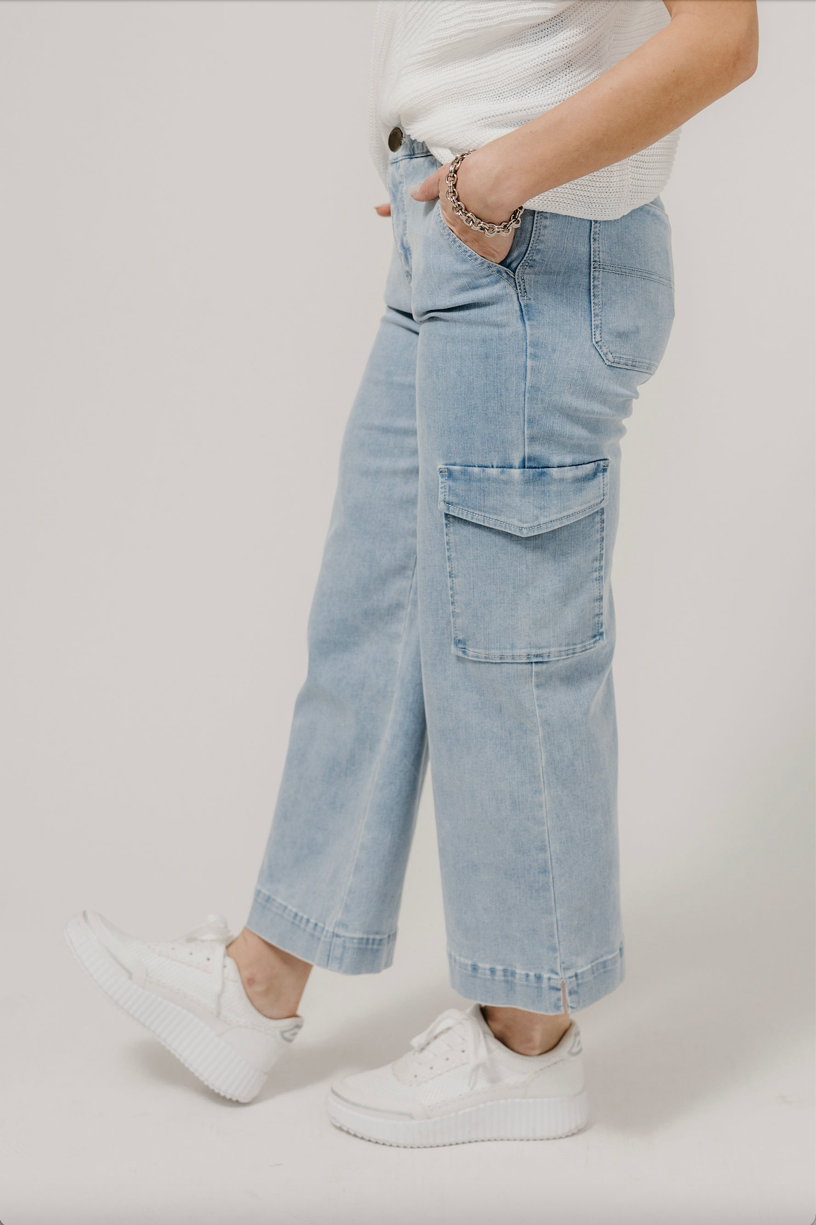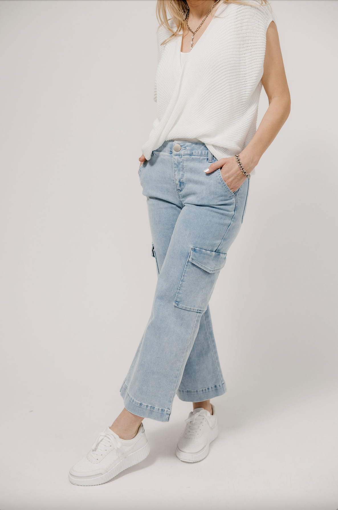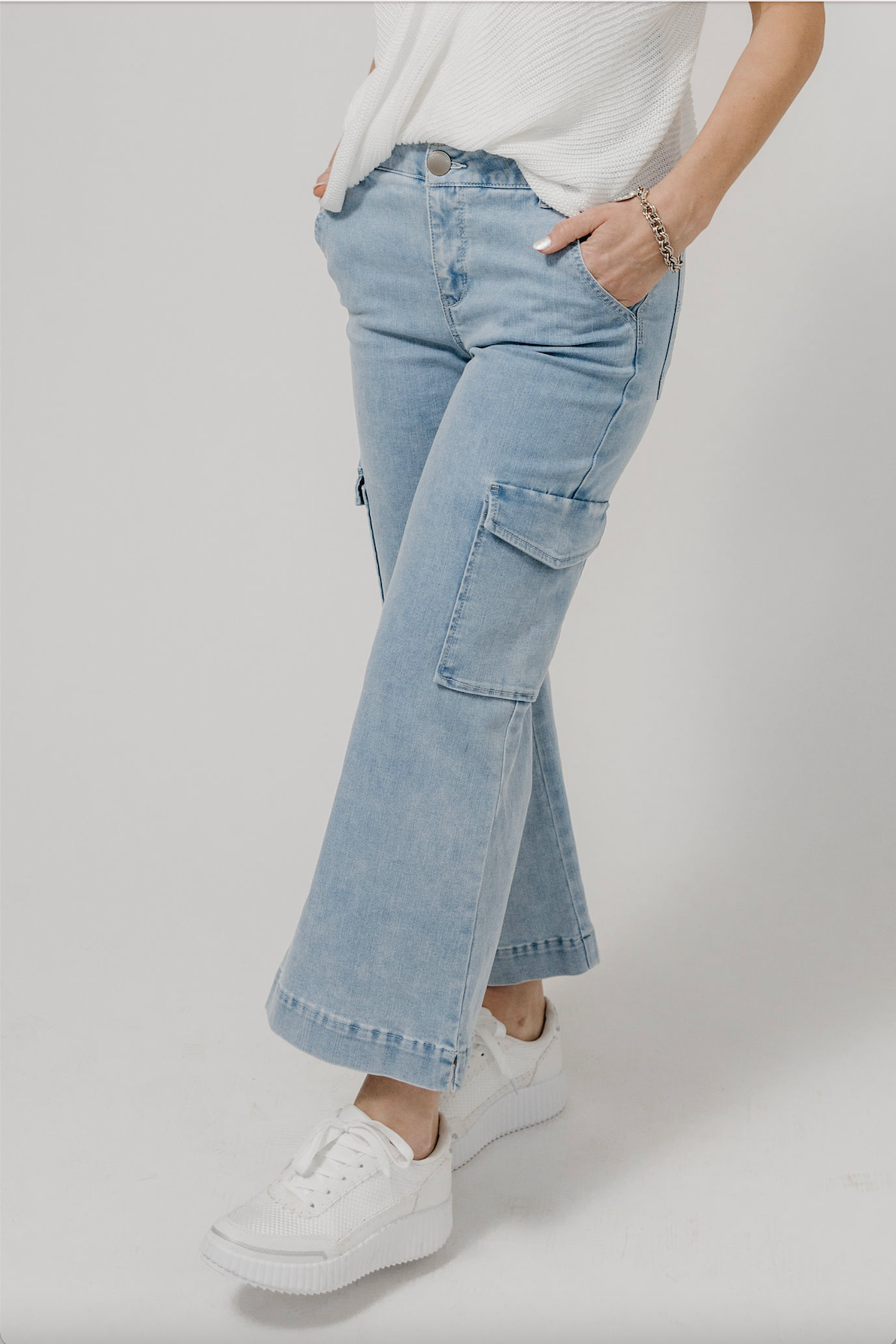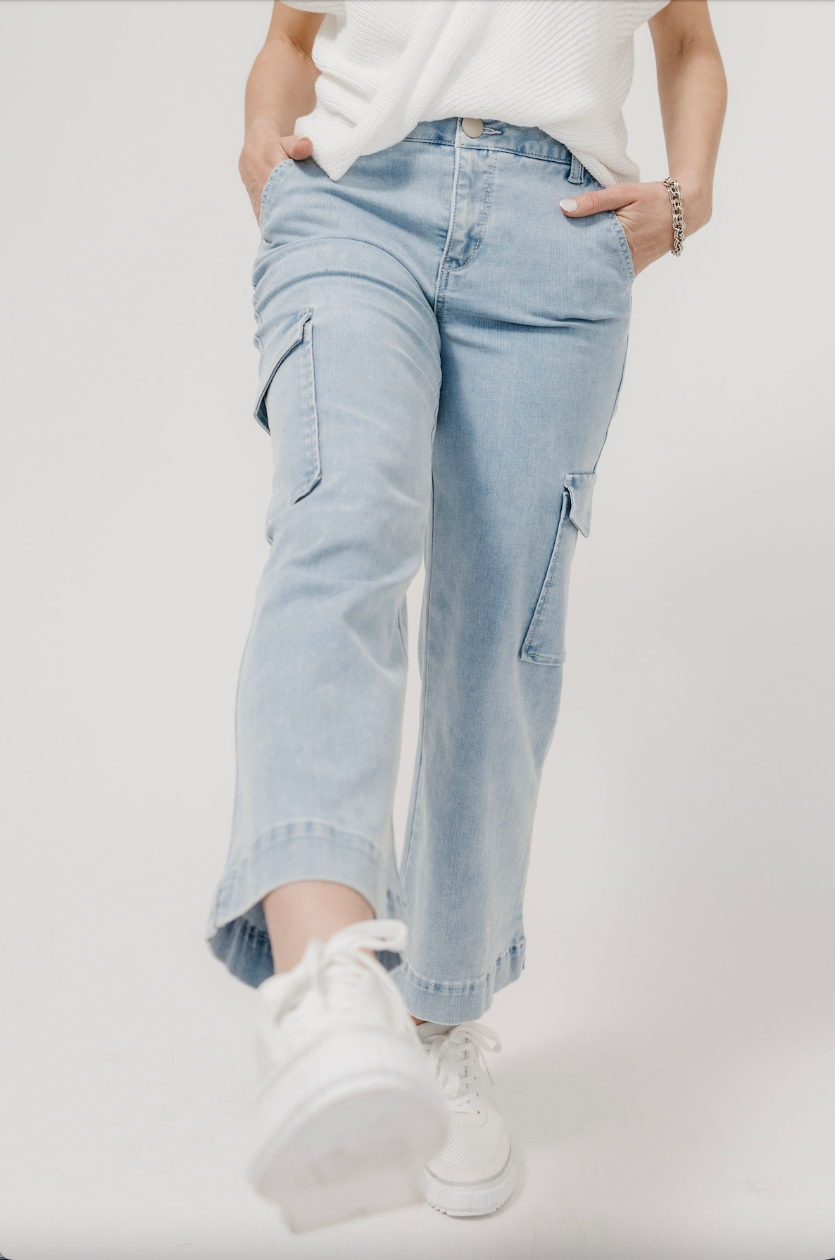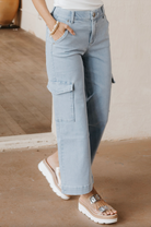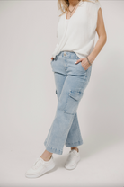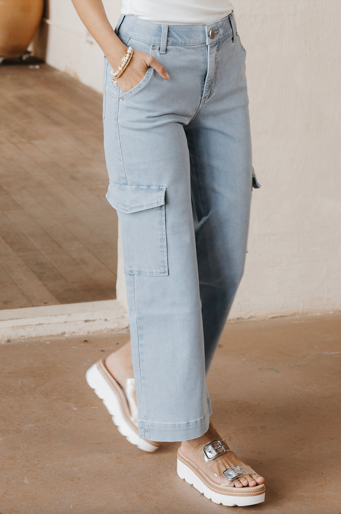 In a refreshing light blue wash, these cargo jeans are a versatile addition to your wardrobe, ready to pair with anything from a simple tank top to a sophisticated blazer.