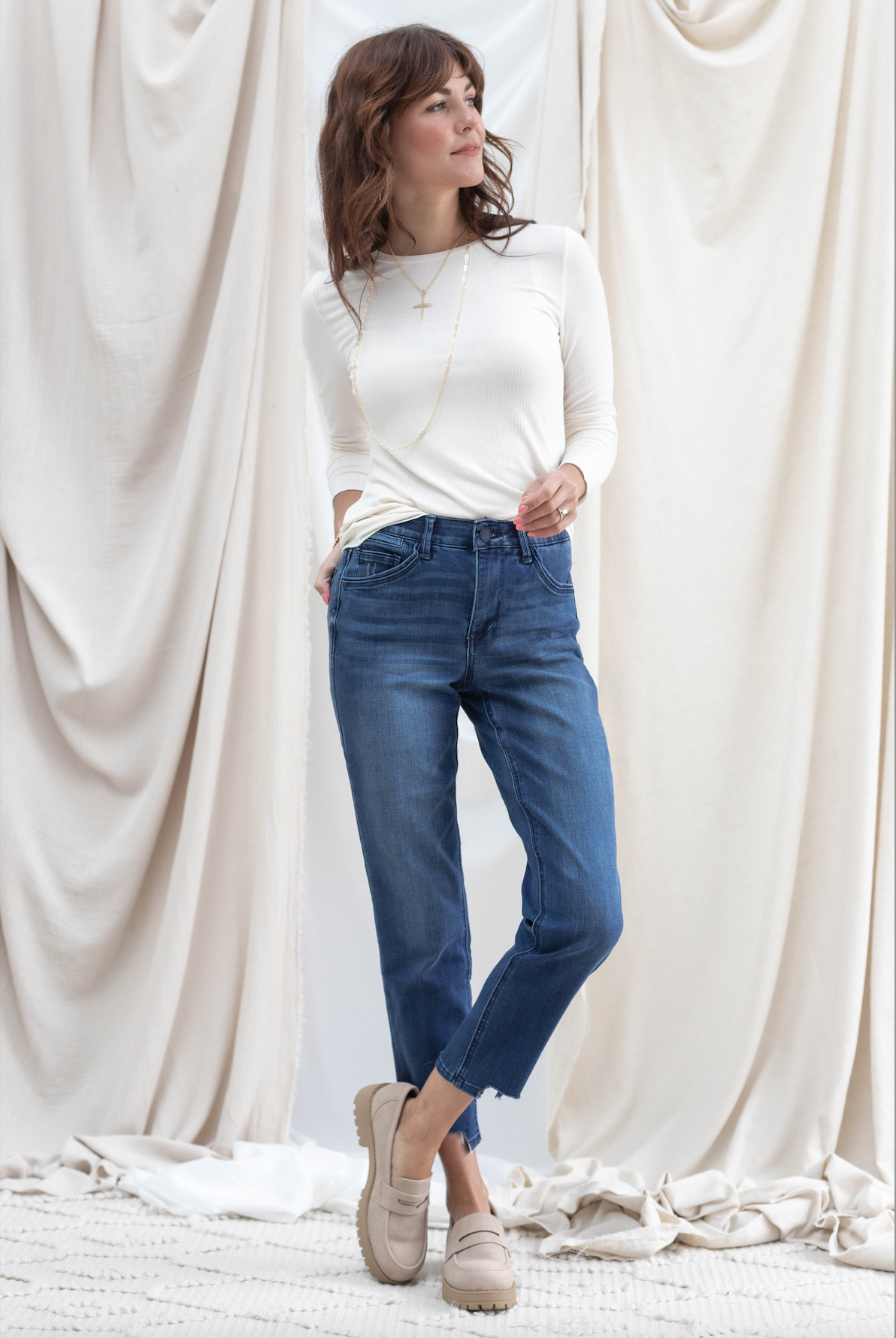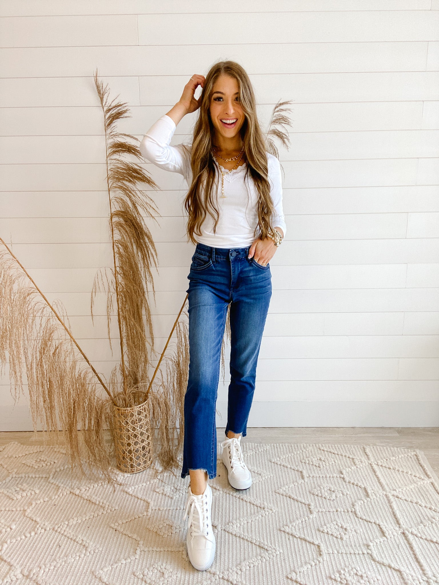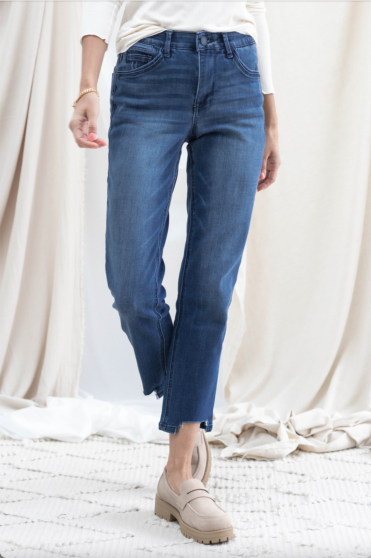 One of our favorite everyday-wear pairs of denim. The true-blue artisanal wash and absence of destruction allows maximum versatility, while the cut-out hemline adds interest and creates the perfect flattering arch. From tennies to heels, you'll be reaching for these slim straights on all occasions!