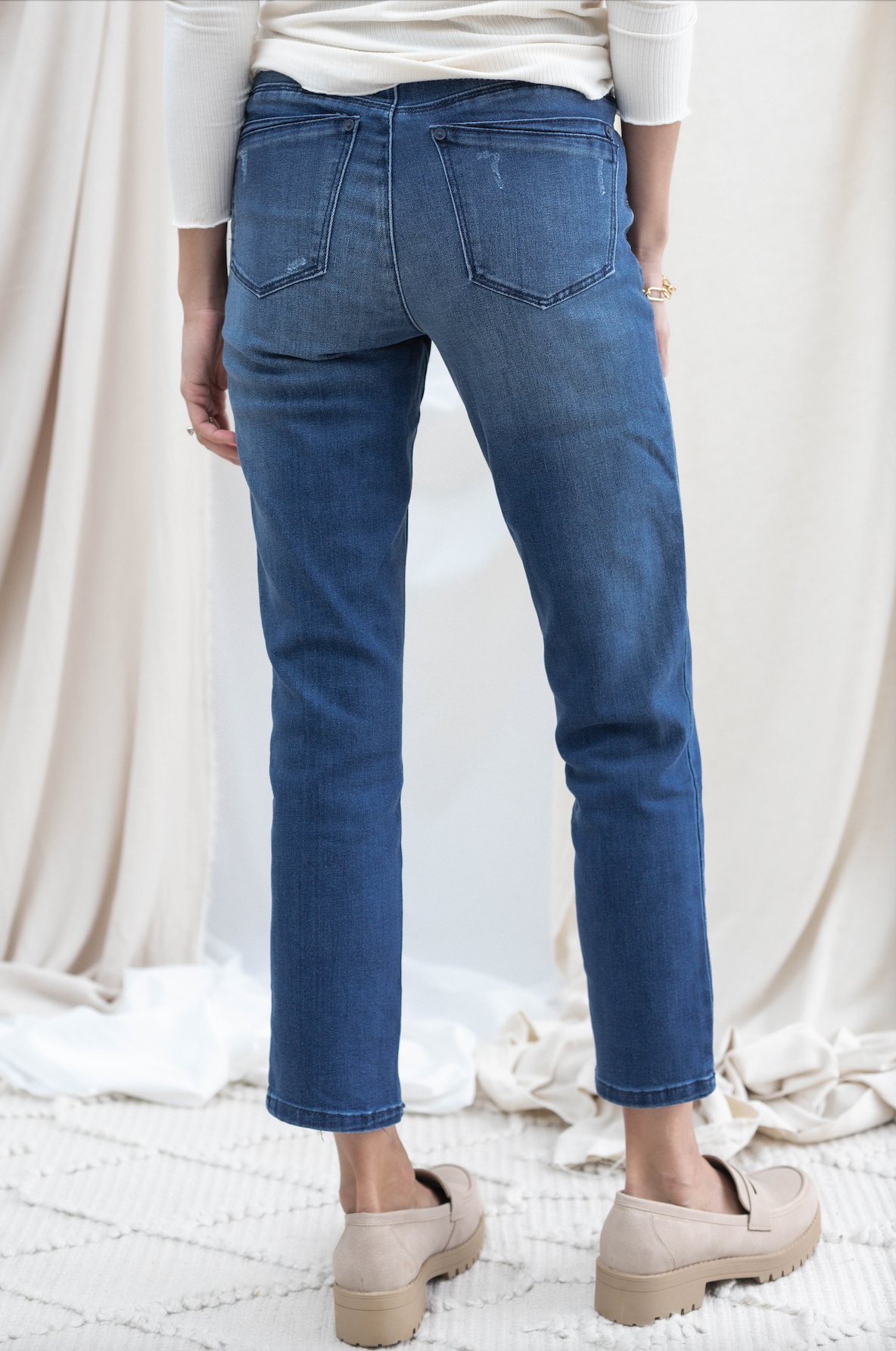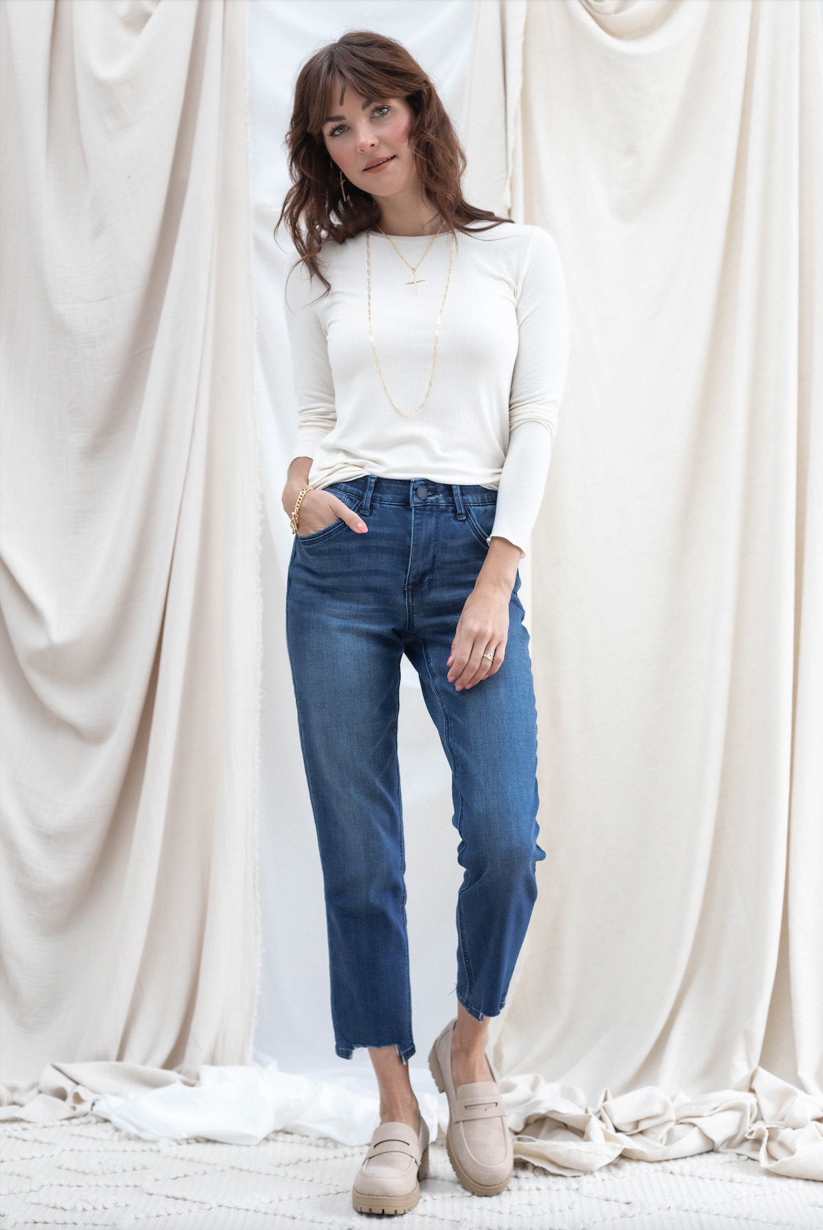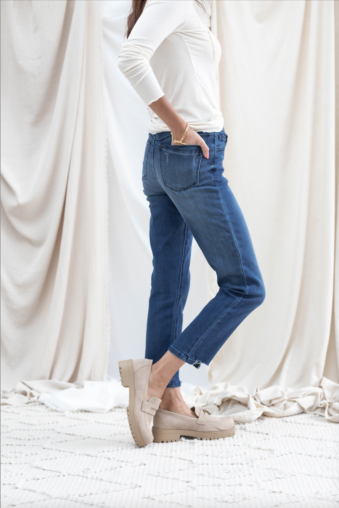 One of our favorite everyday-wear pairs of denim. The true-blue artisanal wash and absence of destruction allows maximum versatility, while the cut-out hemline adds interest and creates the perfect flattering arch. From tennies to heels, you'll be reaching for these slim straights on all occasions!