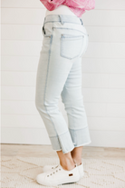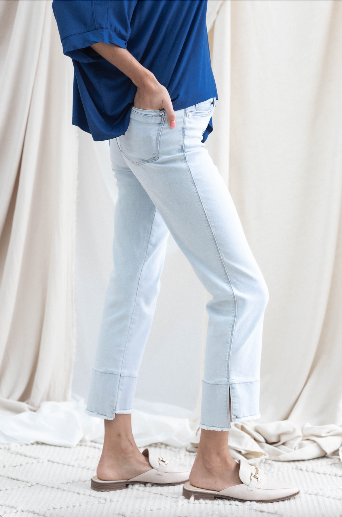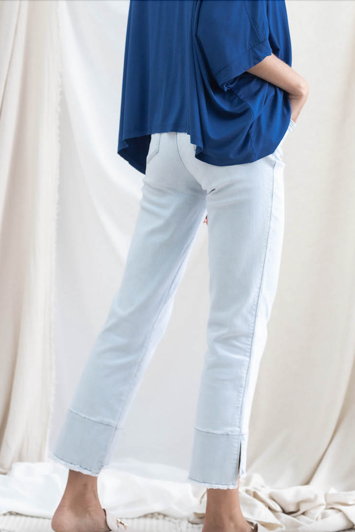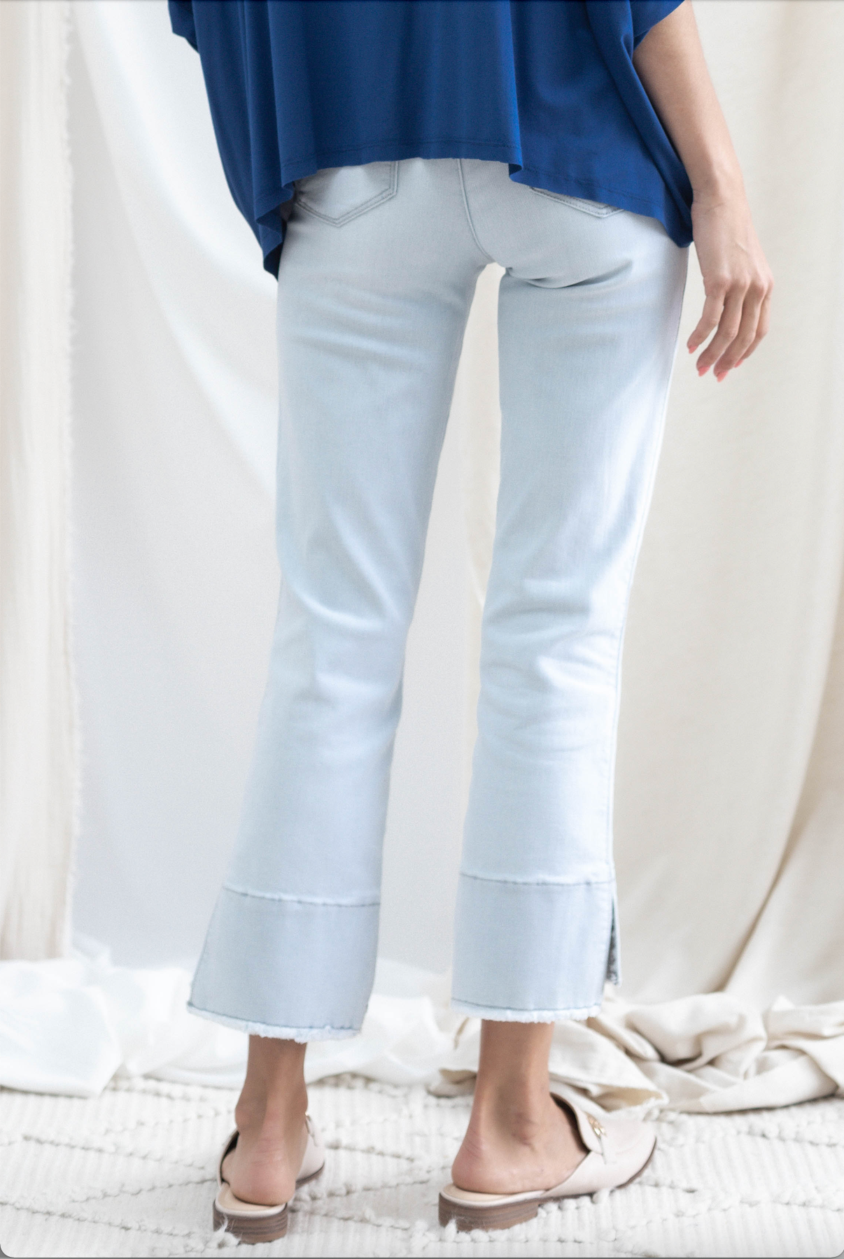 One of our all-time best selling pairs of Mac and Me's, for good reason. Buttery soft fabric, flattering kick flare detailing on the hem, and versatile powder blue wash make for a home run.