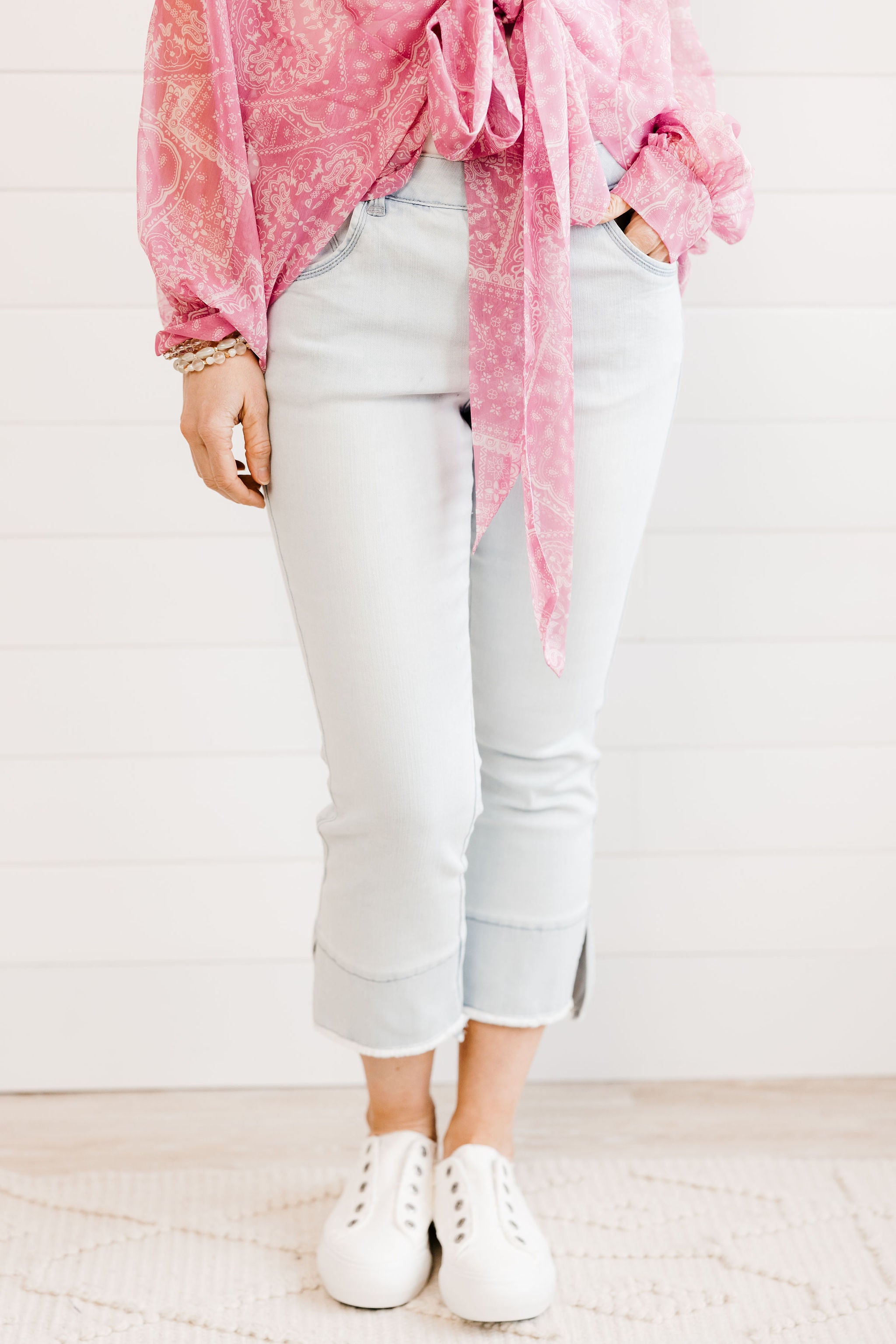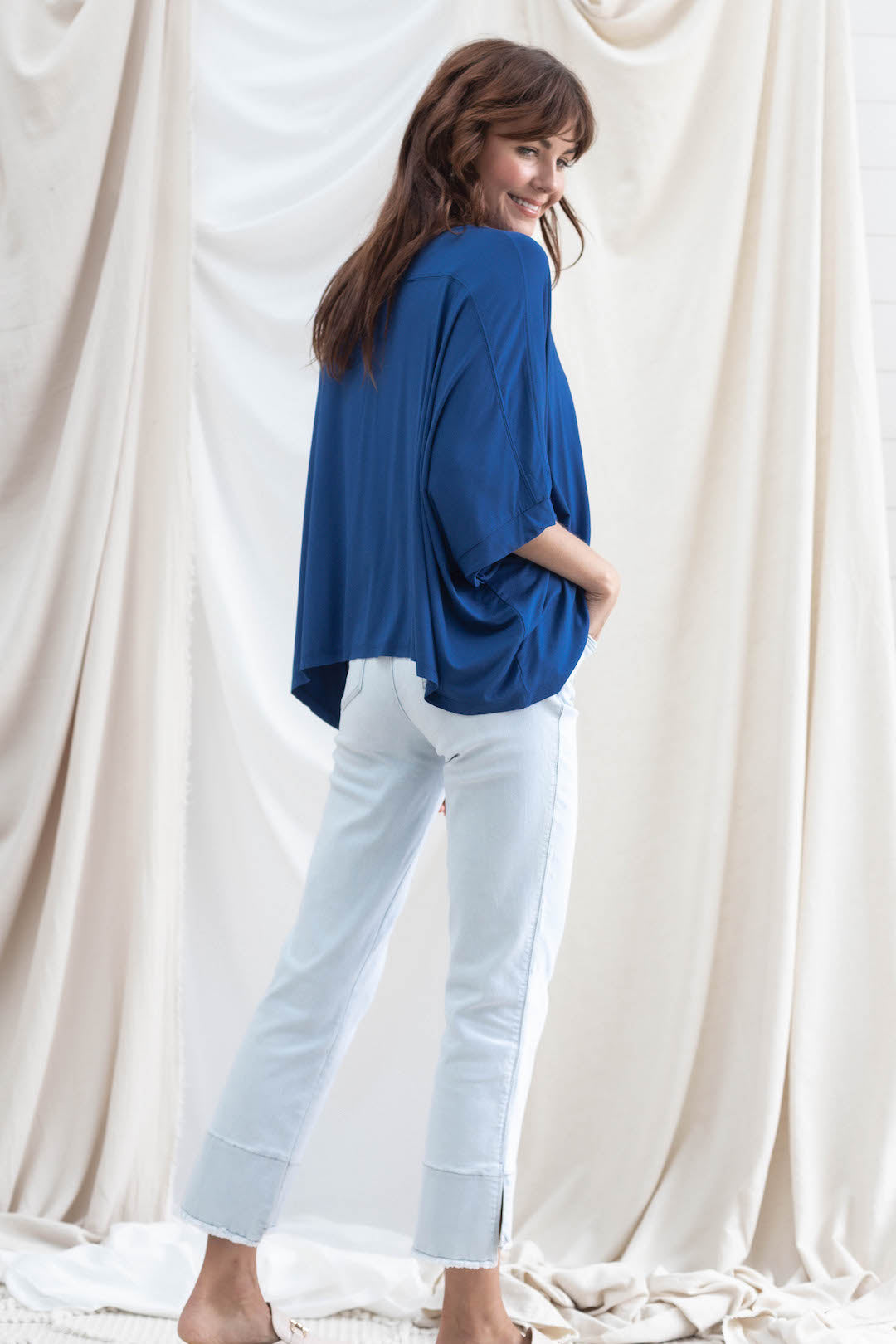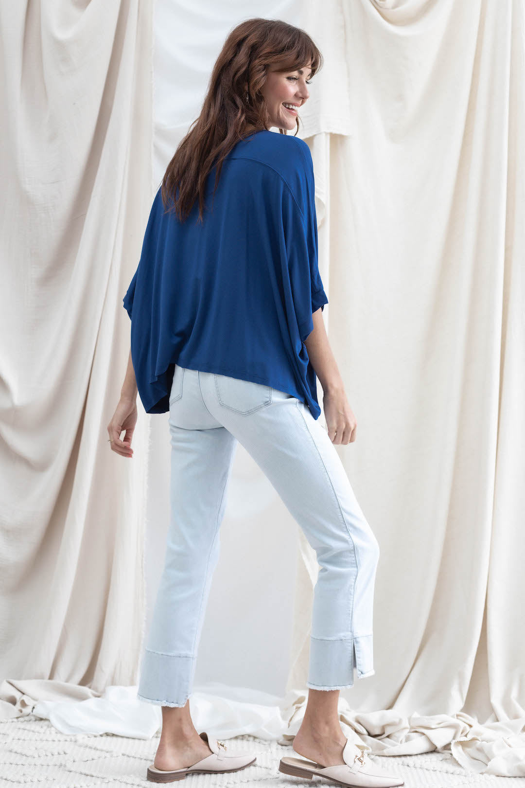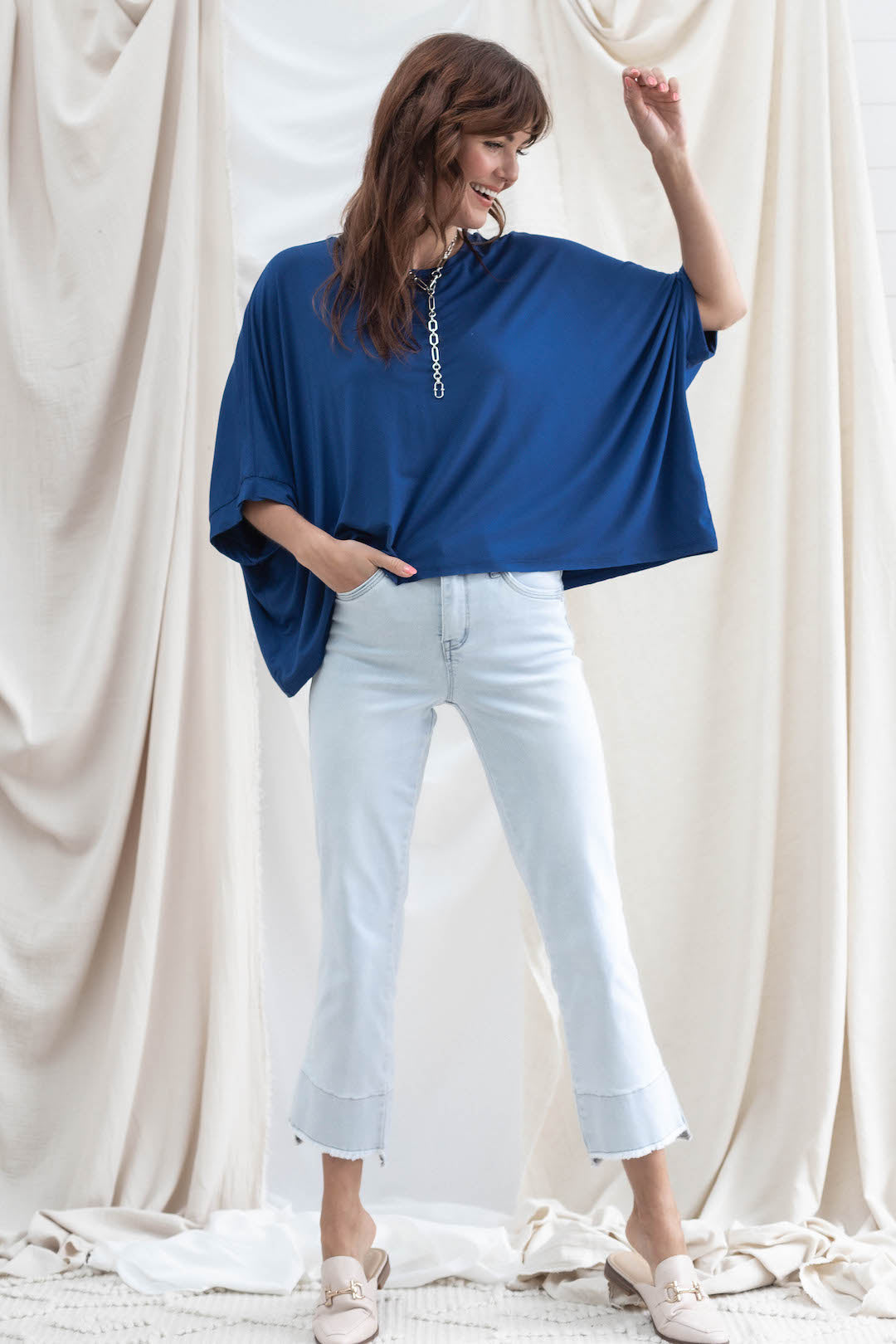 One of our all-time best selling pairs of Mac and Me's, for good reason. Buttery soft fabric, flattering kick flare detailing on the hem, and versatile powder blue wash make for a home run.