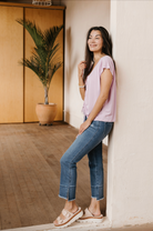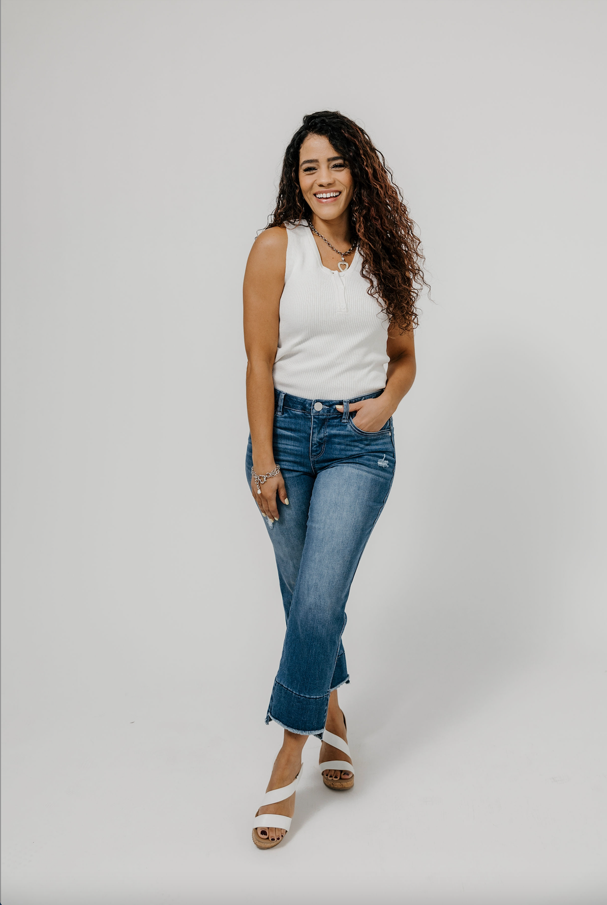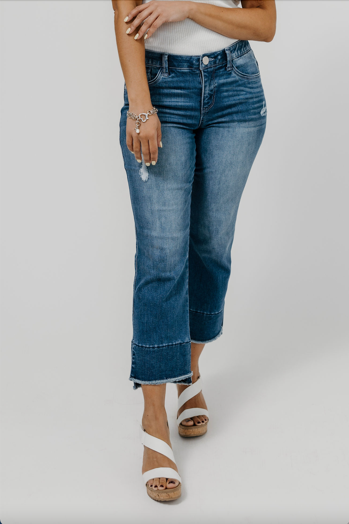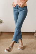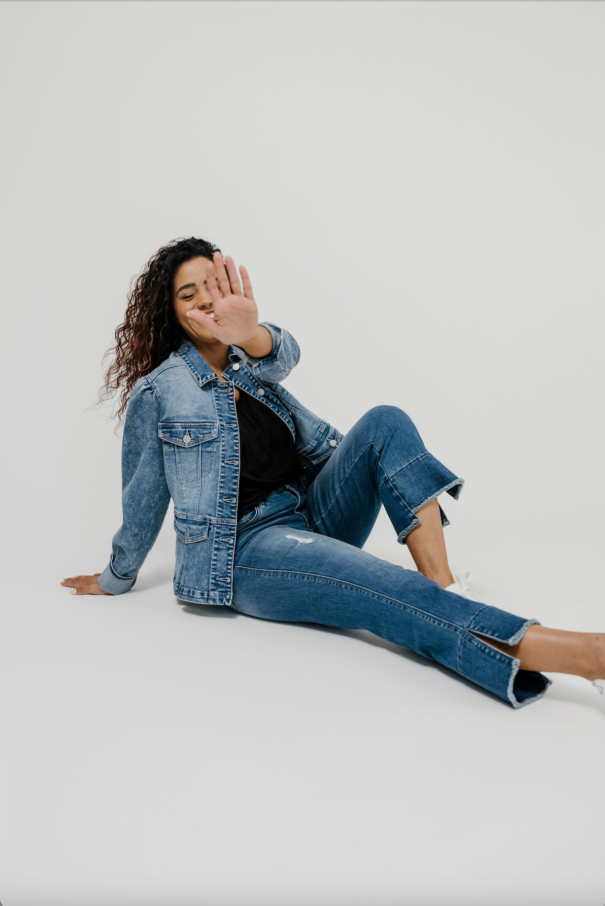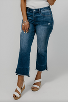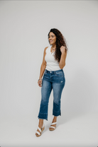 Elevate your everyday denim with the effortlessly stylish Kick Flare Jeans. Expertly crafted to enhance and flatter any silhouette, these jeans are a standout with their unique kick flare cut. They feature our famous Mac and Me hidden stretch waistband, to hold you in, lift you up, and flatter you in all the right places. They're a comfortable mid-rise fit and with a carefully tailored (and stretchy!) waist that gracefully transitions into a relaxed thigh and knee before flaring out slightly above the ankle. The raw, frayed hem adds a modern, edgy finish, perfect for showcasing your favorite sandals or sneakers. Made from premium, stretch-infused denim, these jeans ensure all-day comfort without sacrificing style. Pair them with a simple tee for a casual look, or dress them up with a chic blouse for an evening out.