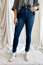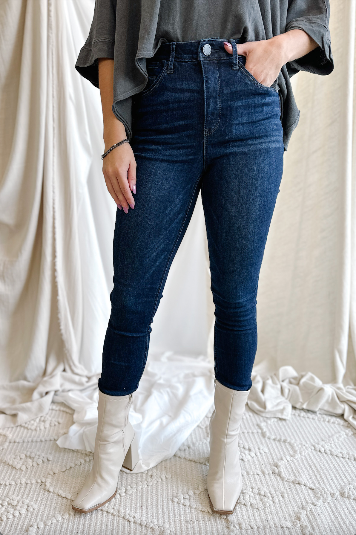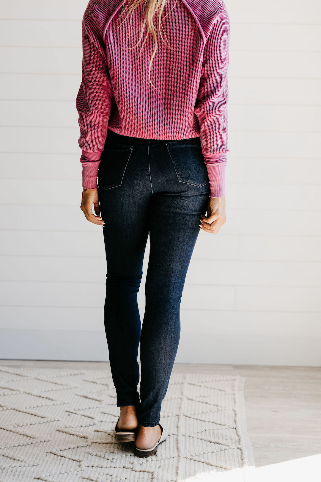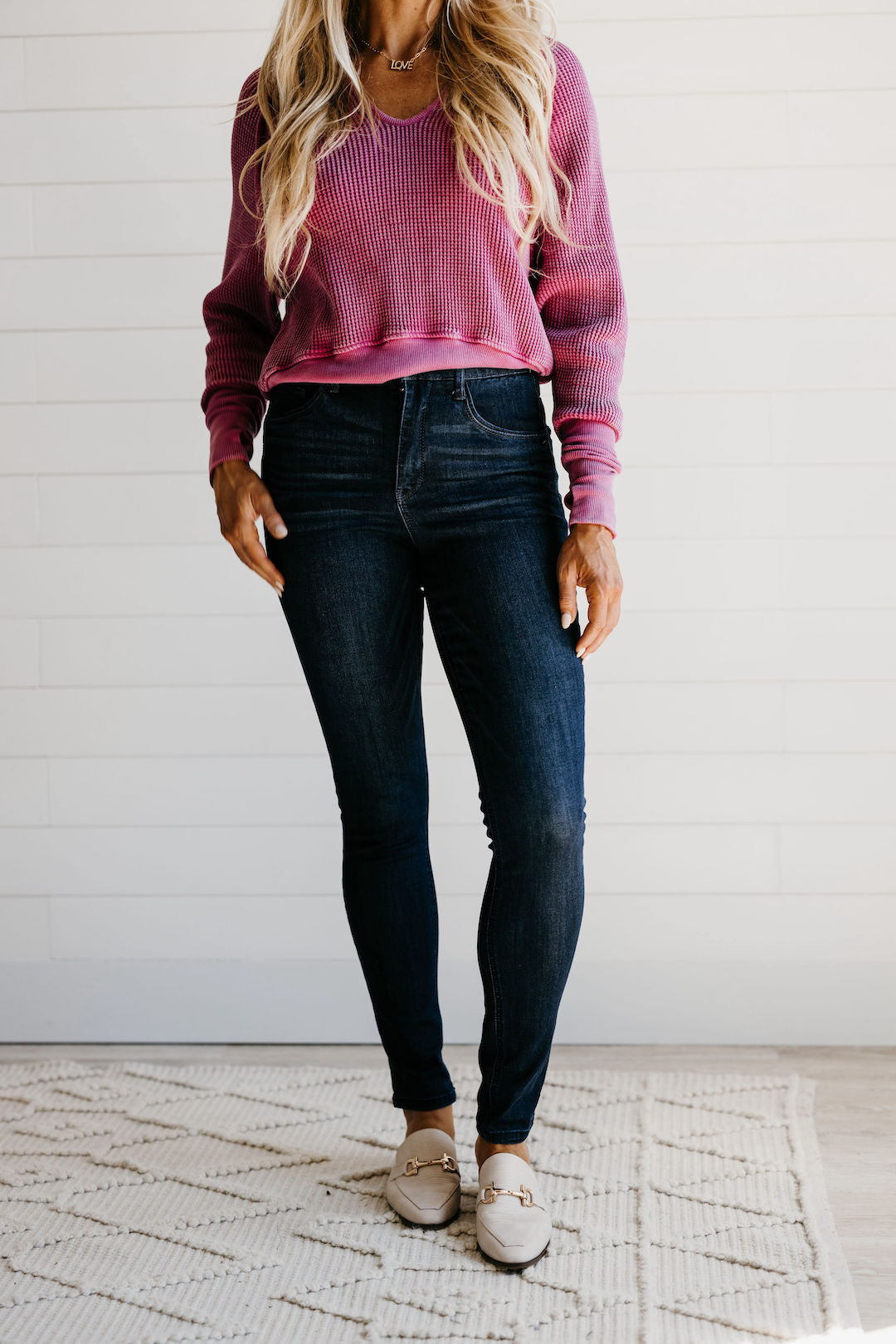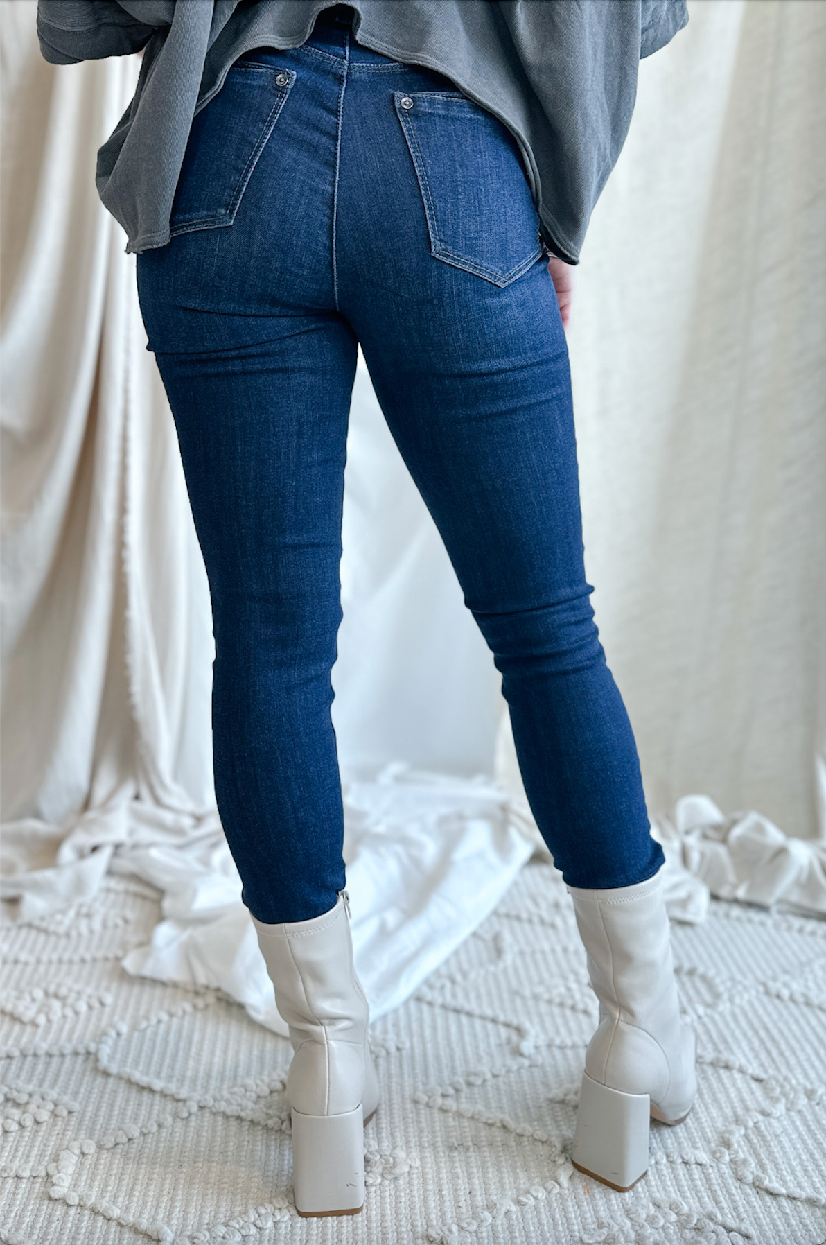 The "skyrise" comes from our 11" rise - for optimal flattery! The inseam is also a bit longer, at 31" for our taller gals. Sleek, no destruction, and an easy pant to dress up.
