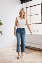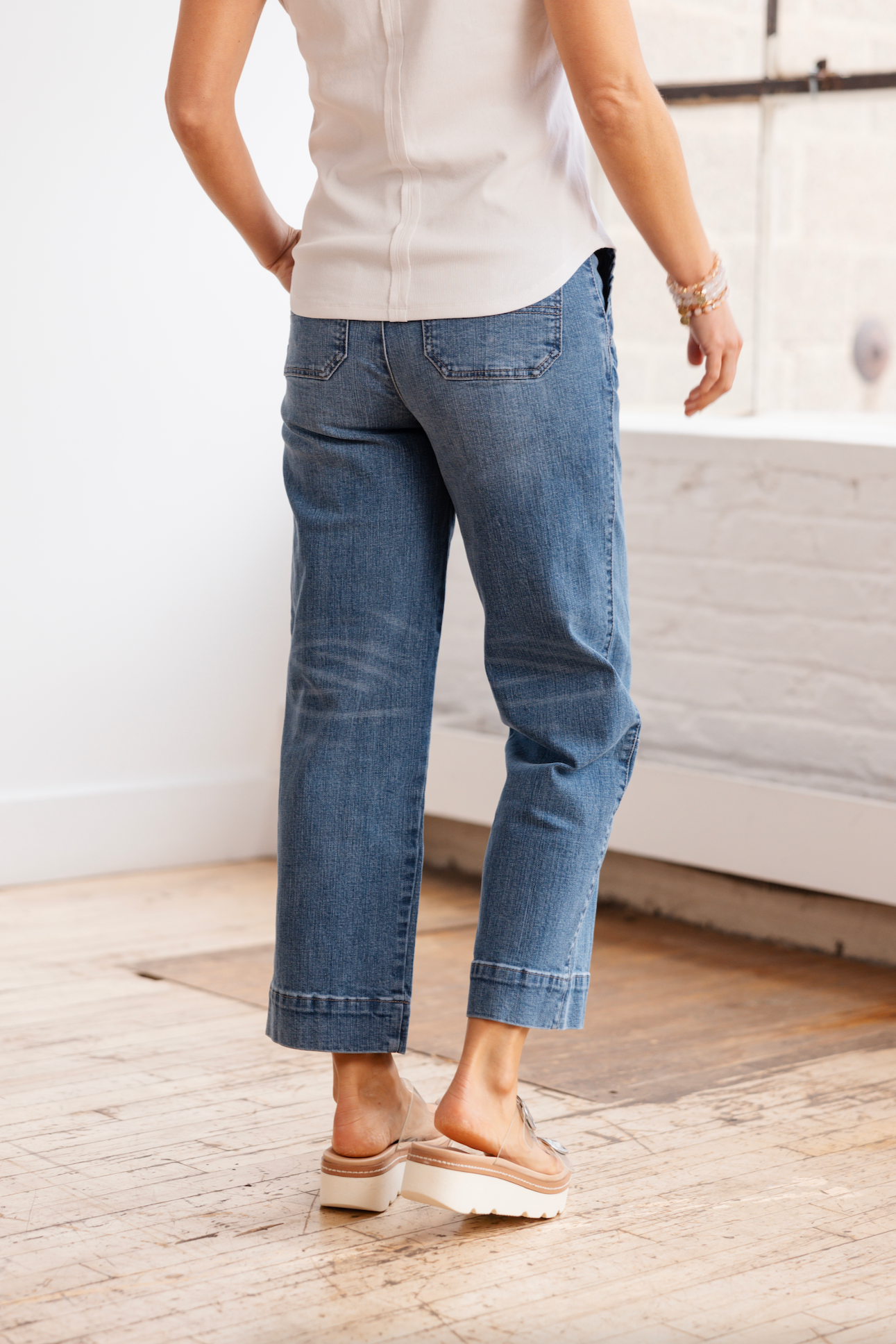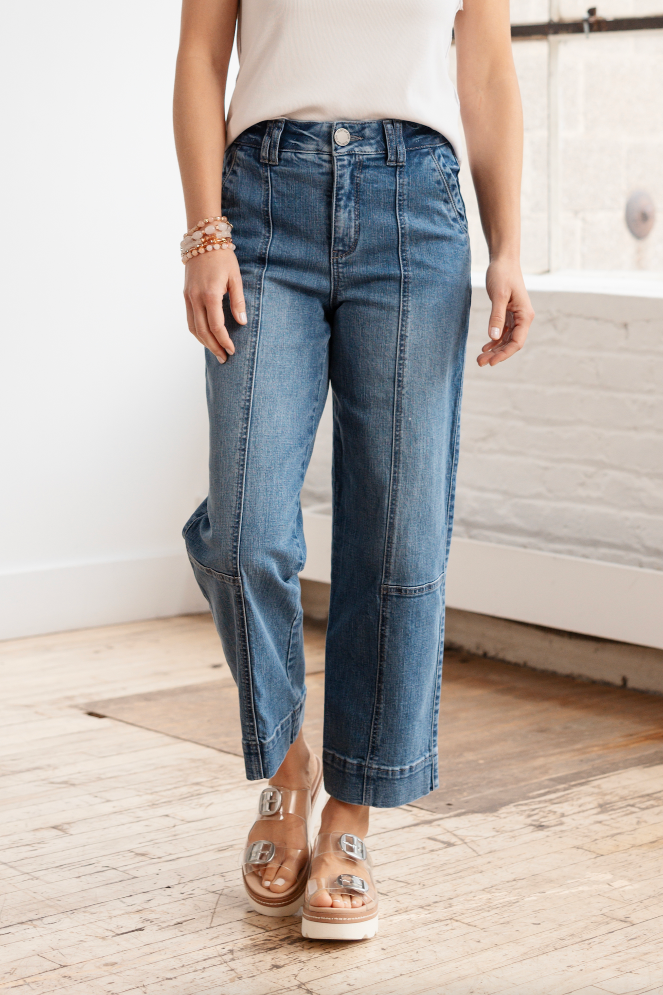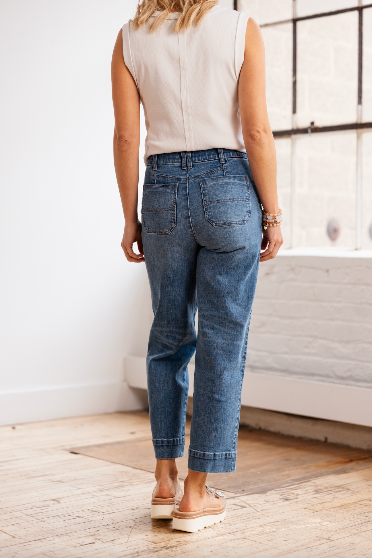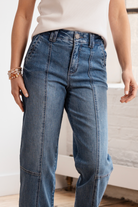 Our effortlessly stylish straight leg with utility detailing. The standout front seam details add a touch of sophistication and elongate the silhouette, while the classic medium wash makes them versatile for any wardrobe. Perfect for casual days or elevated looks, these jeans are designed to be both stylish and functional. A must-have for those seeking unique yet timeless denim!
