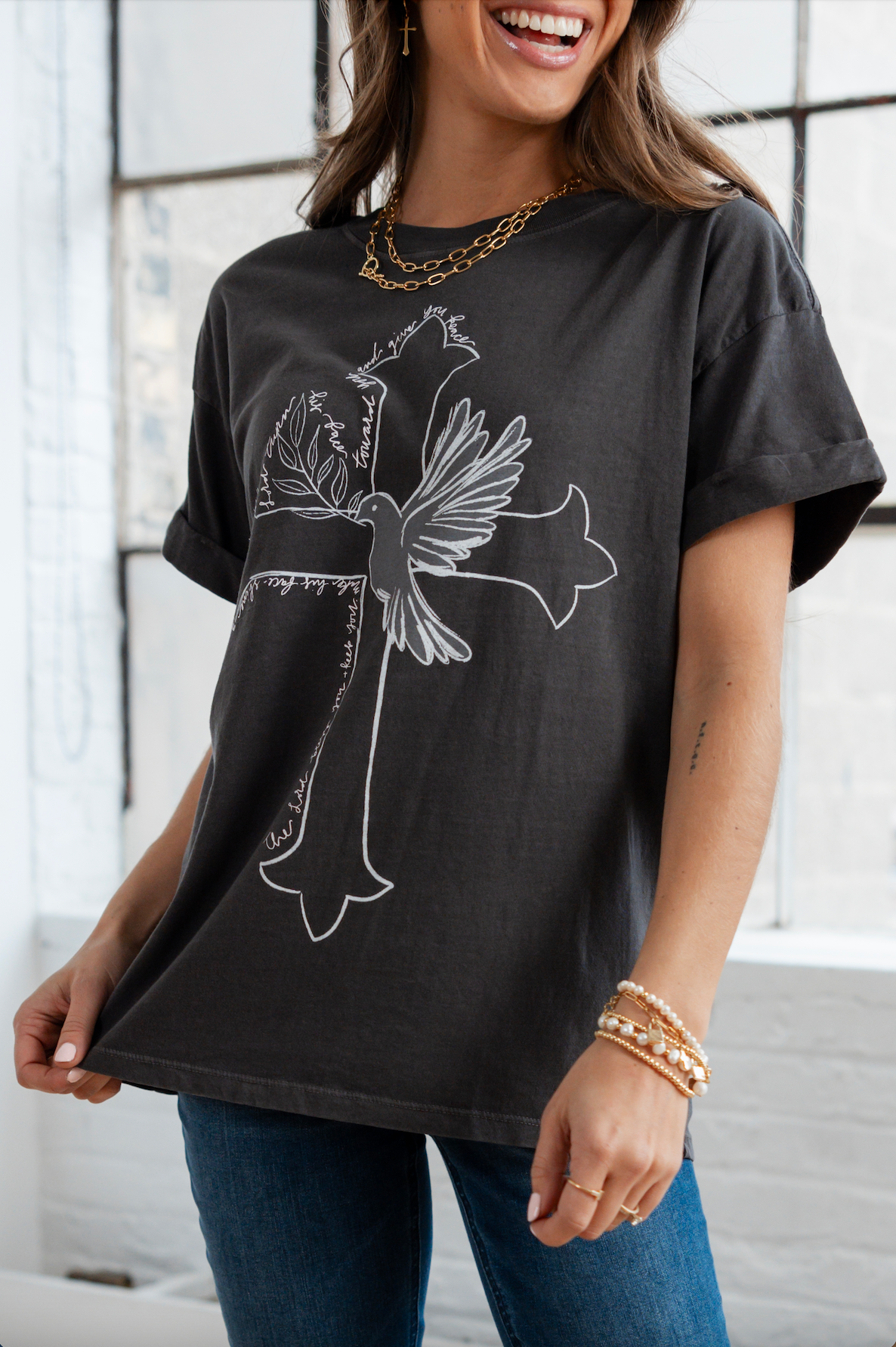 Our graphic tees are 100% cotton, and are oh-so-soft. Featuring rolled sleeves and a boyfriend fit, our graphic tees will quickly become something you’re reaching for daily! Internal neck tag says “you are so loved” - so you remember how loved you are every time you get dressed.