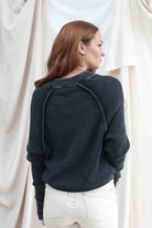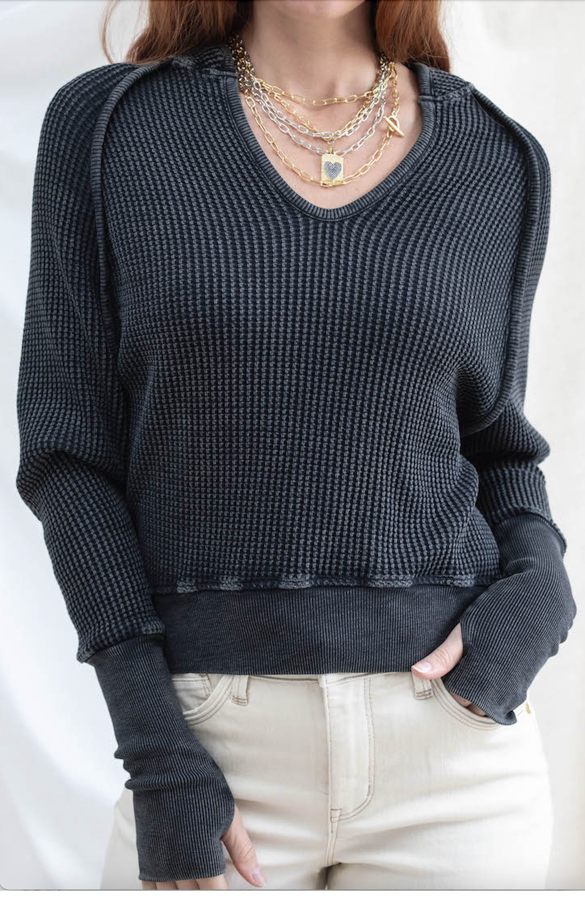 Cozy, comfortable, and so flattering. From the airport and beyond, you'll be reaching for this gorgeous piece often! It even has thumbholes (that lay closed nicely when you're not wearing them).