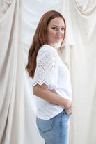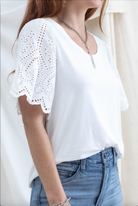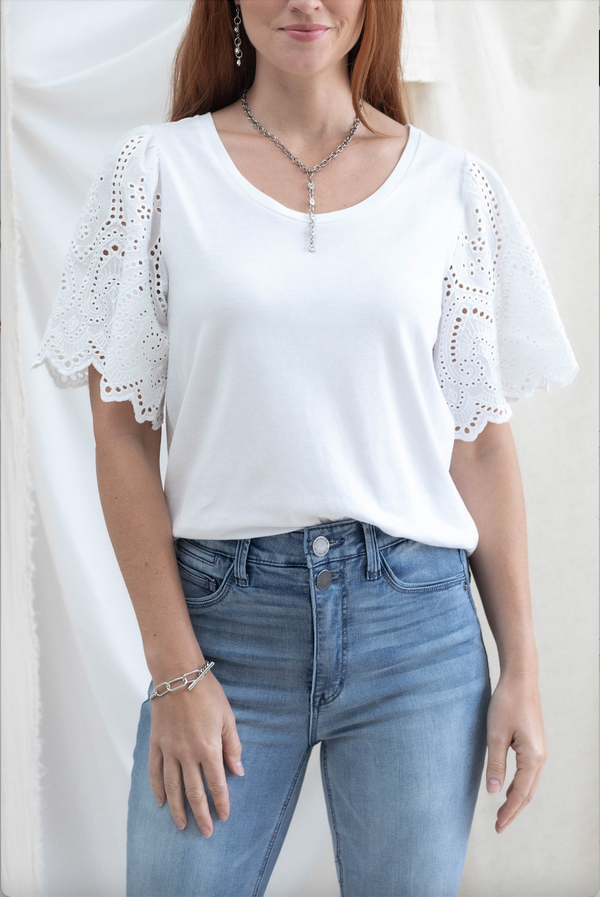A feminine flutter eyelet sleeve, with a soft, stretchy bodice.