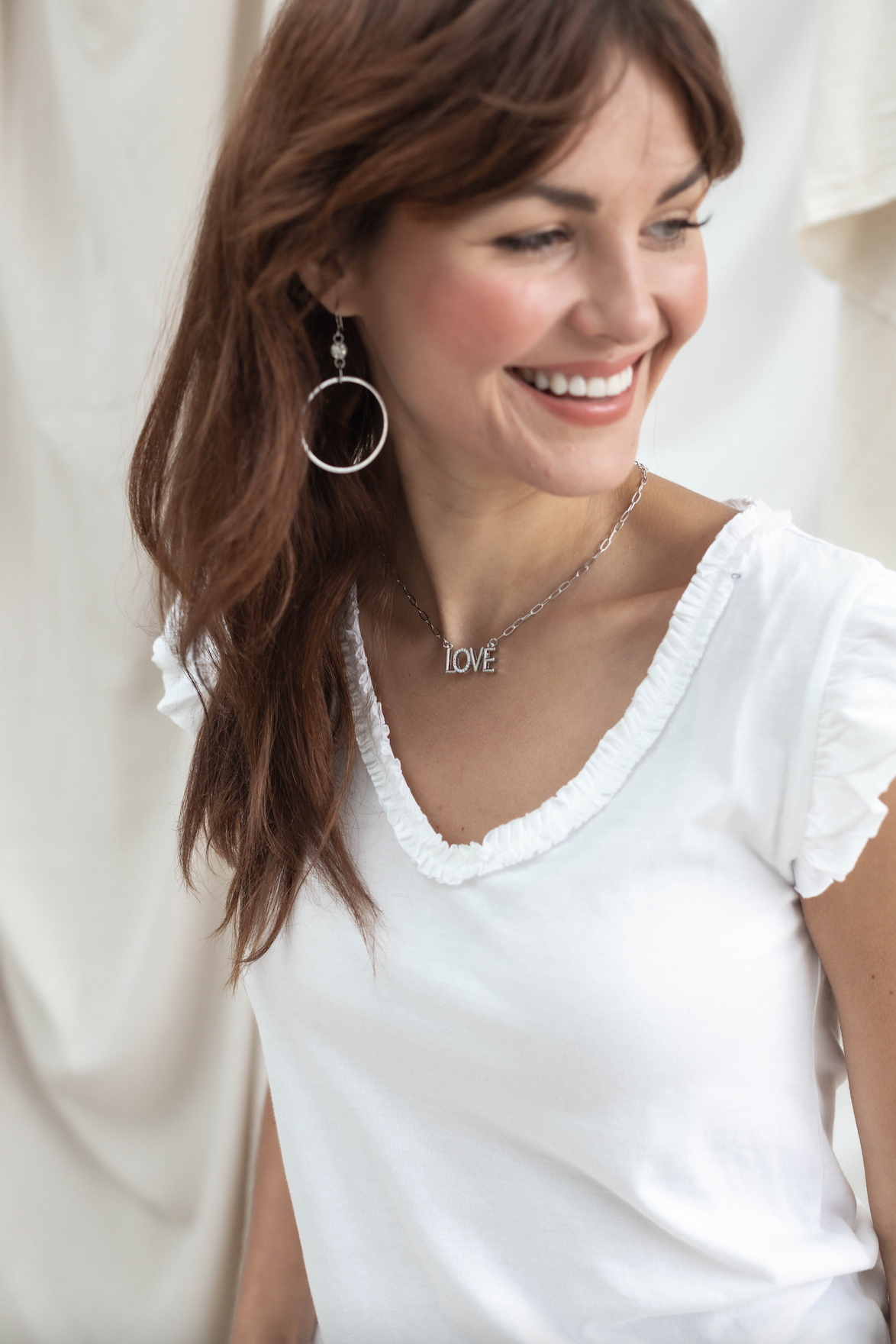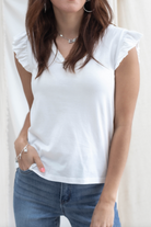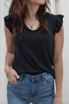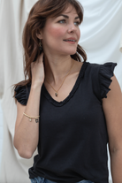 This not-so-basic-basic has gorgeous, feminine detailing around the neckline, and a baby ruffle sleeve detail. The minimal sleeve makes it the perfect layering piece under jackets or sweaters, as it wont create any extra bulk.