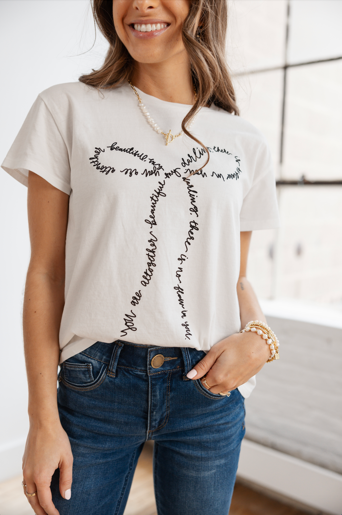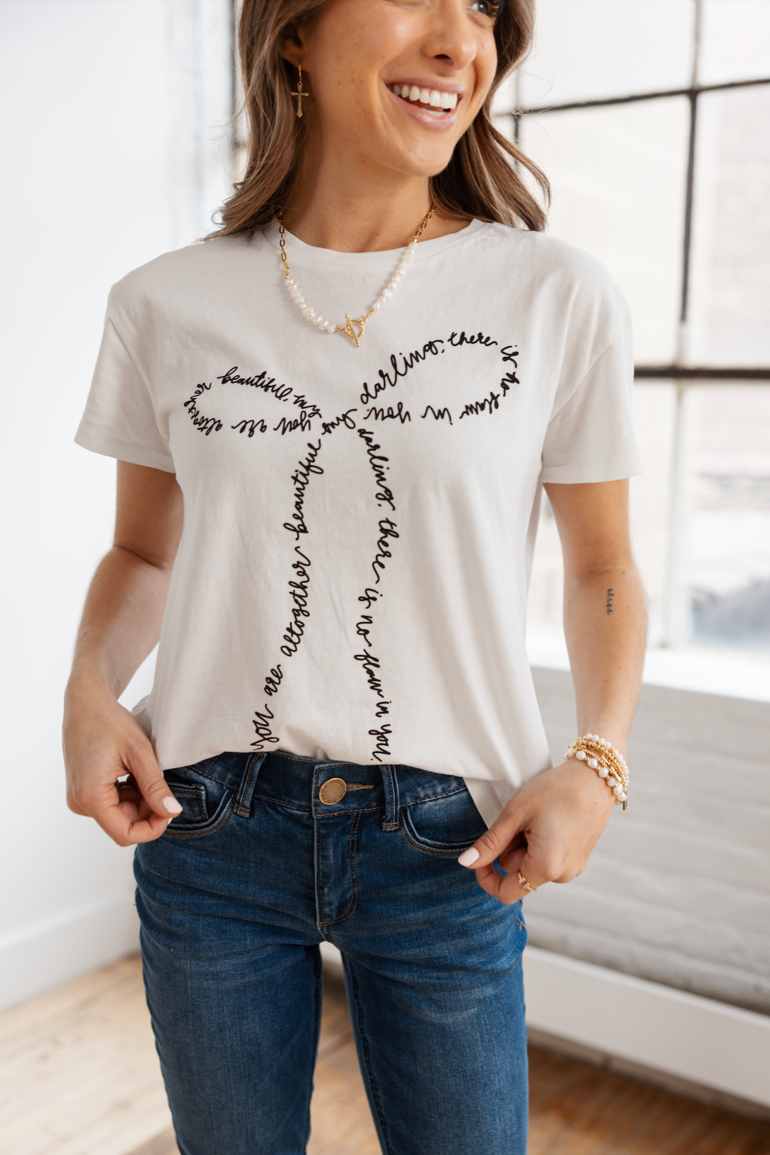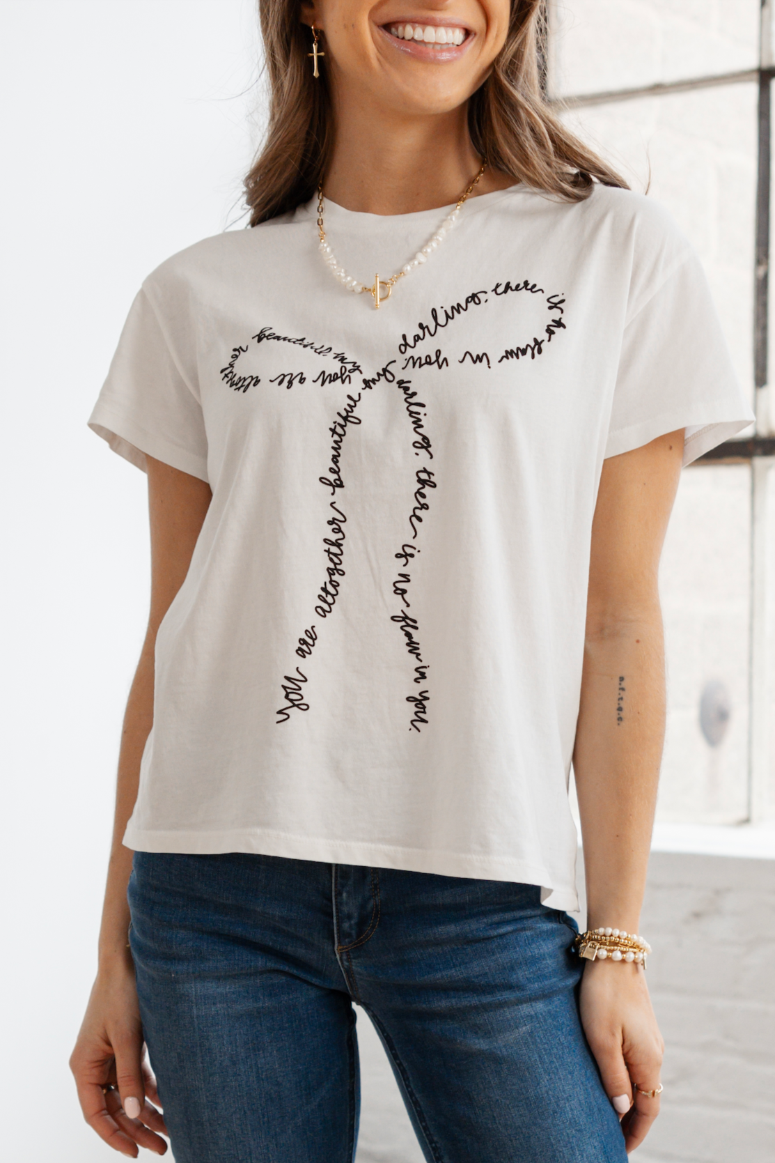 Altogether Beautiful - this tee features a handwritten verse from Song of Songs 4:7, saying “You are altogether beautiful, my darling; there is no flaw in you handwritten,” in the shape of a bow. Feminine, uplifting, and a beautiful reminder.