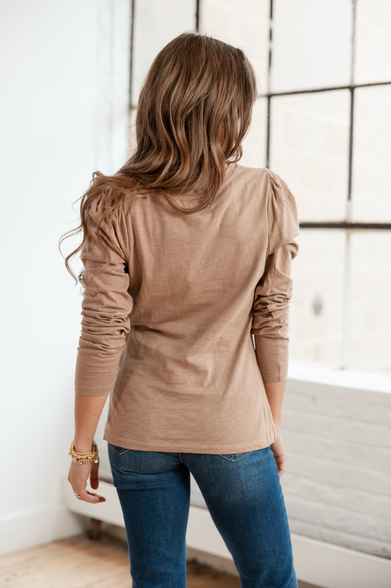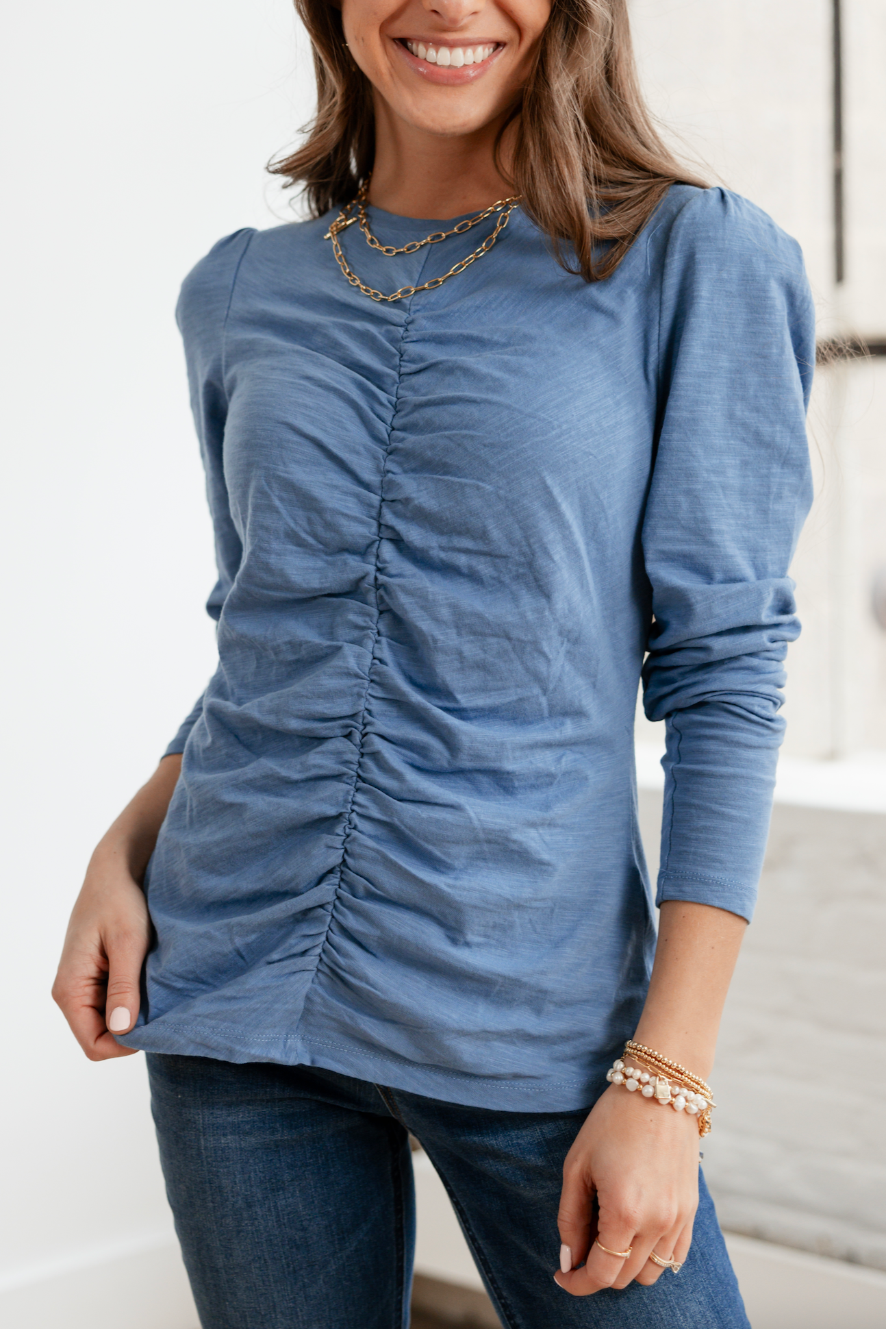 This top features a soft cotton fabric with a flattering ruched detail running down the center front, creating a gently gathered effect. Long sleeves and a crew neckline keep the look classic, while the ruching adds a modern, feminine twist. Perfect for pairing with denim or dressing up with accessories for an elevated casual style!