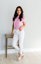 Stripes - an easy classic made fresh in this cool navy and bright pink! We added a little pleat on the shoulder to give you some extra wiggle room, and to elevate this not-so-basic-basic. As always, it's completely comfortable and full of stretch.
