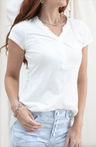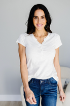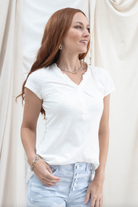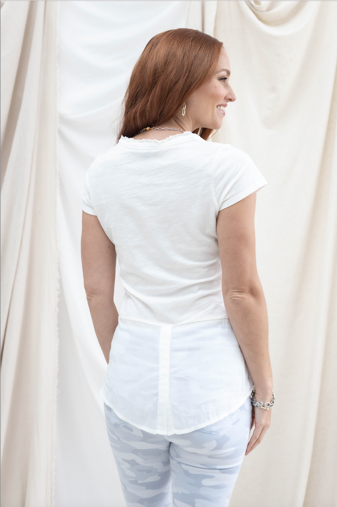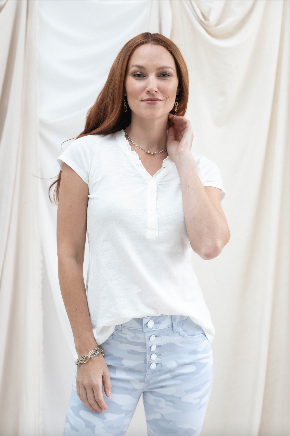 This top has all the feminine details, while still remaining in the "everyday-wear" category (because we do tend to want to wear this everyday!). Complete with dimensional detail surrounding the neckline, buttons, and a gorgeous chiffon-like detail on the back hemline. This top is lightweight, stretchy, and comfortable.