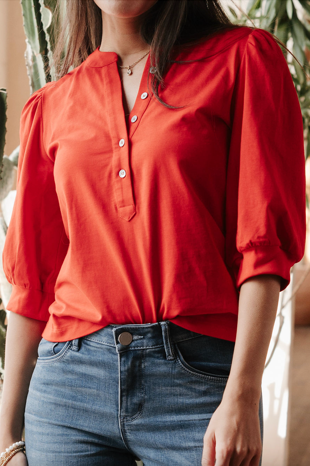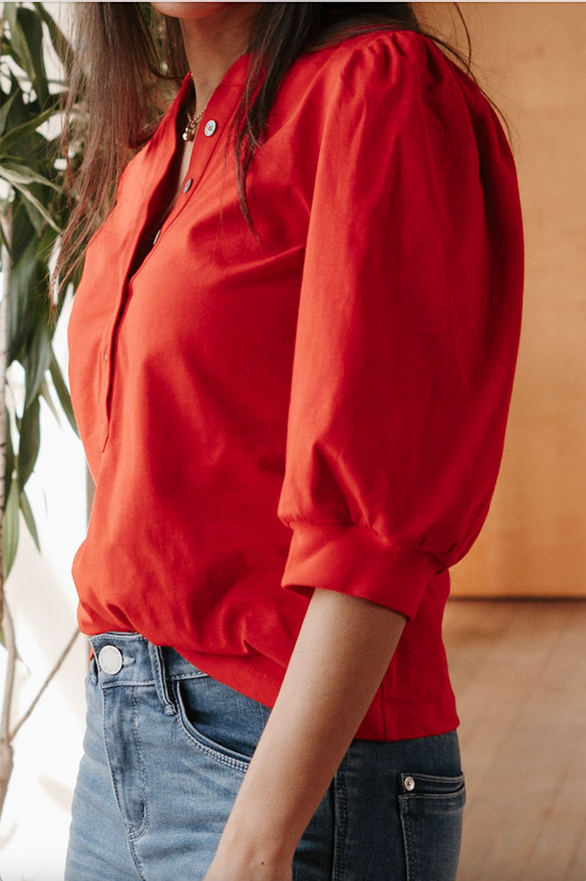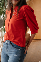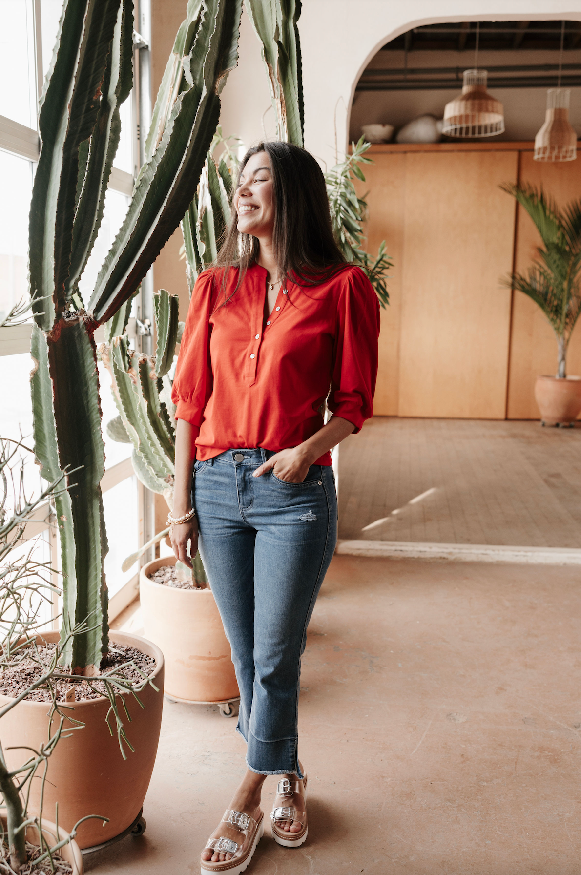 Embrace effortless sophistication with the Chloe Button Front Top. The radiant red stands out with its rich hue and stylish puff sleeves. The flattering half-button front adds a touch of charm, while the lightweight fabric keeps you comfortable throughout the day. Whether you're headed to brunch or a casual evening outing, this blouse pairs beautifully with jeans or skirts for an effortlessly polished look.