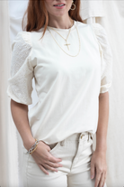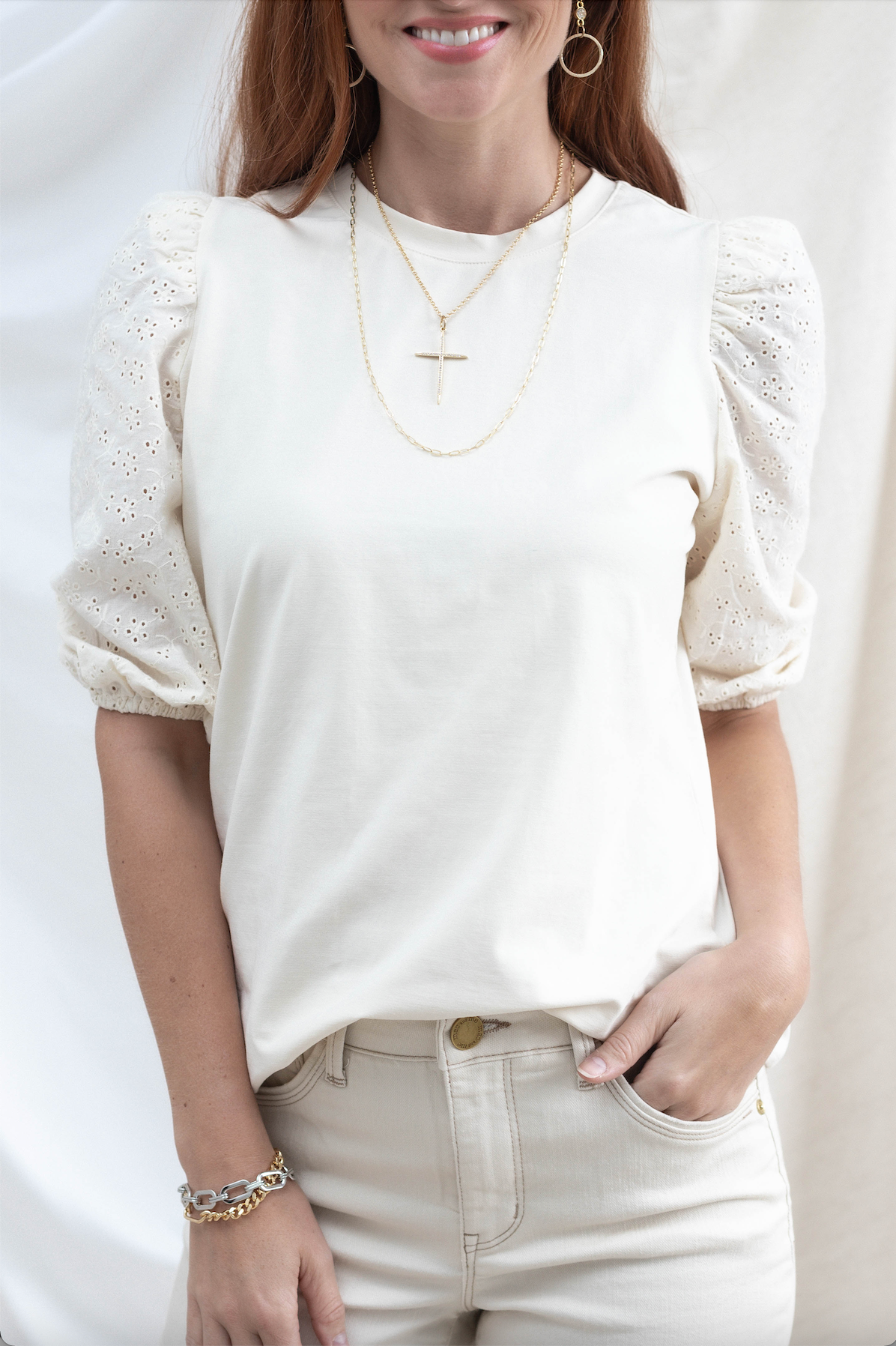 If there’s one thing we know how to do, it’s to make things adorable and comfortable - and this eyelet sleeve top is no exception. This top has the ideal sleeve length to give you some arm coverage, a stretchy body, and feminine eyelet details.