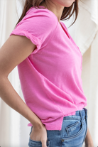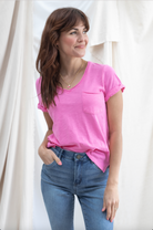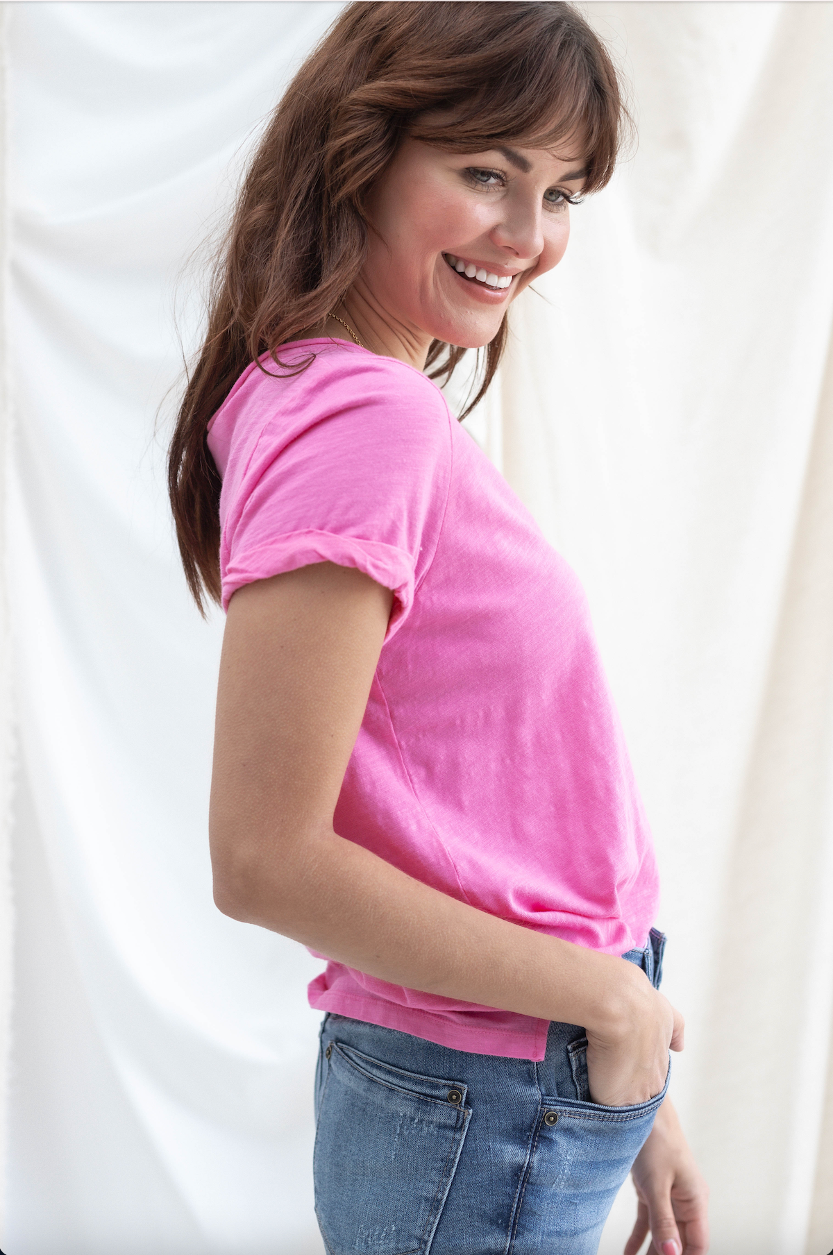 That classic v-neck top, with the "just right" lived-in vintage feel. The sleeves feature double roll cuffs, and the pocket is the idea size for visual flattery. Our V-neckline is flattering on all shapes and sizes, and has a subtle roll detail to add dimension framing your face. Wear her alone, or layer her under your favorite jacket -- either way, this gorgeous color is going to make you shine!
