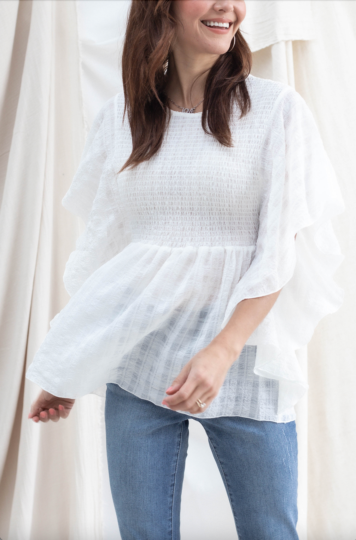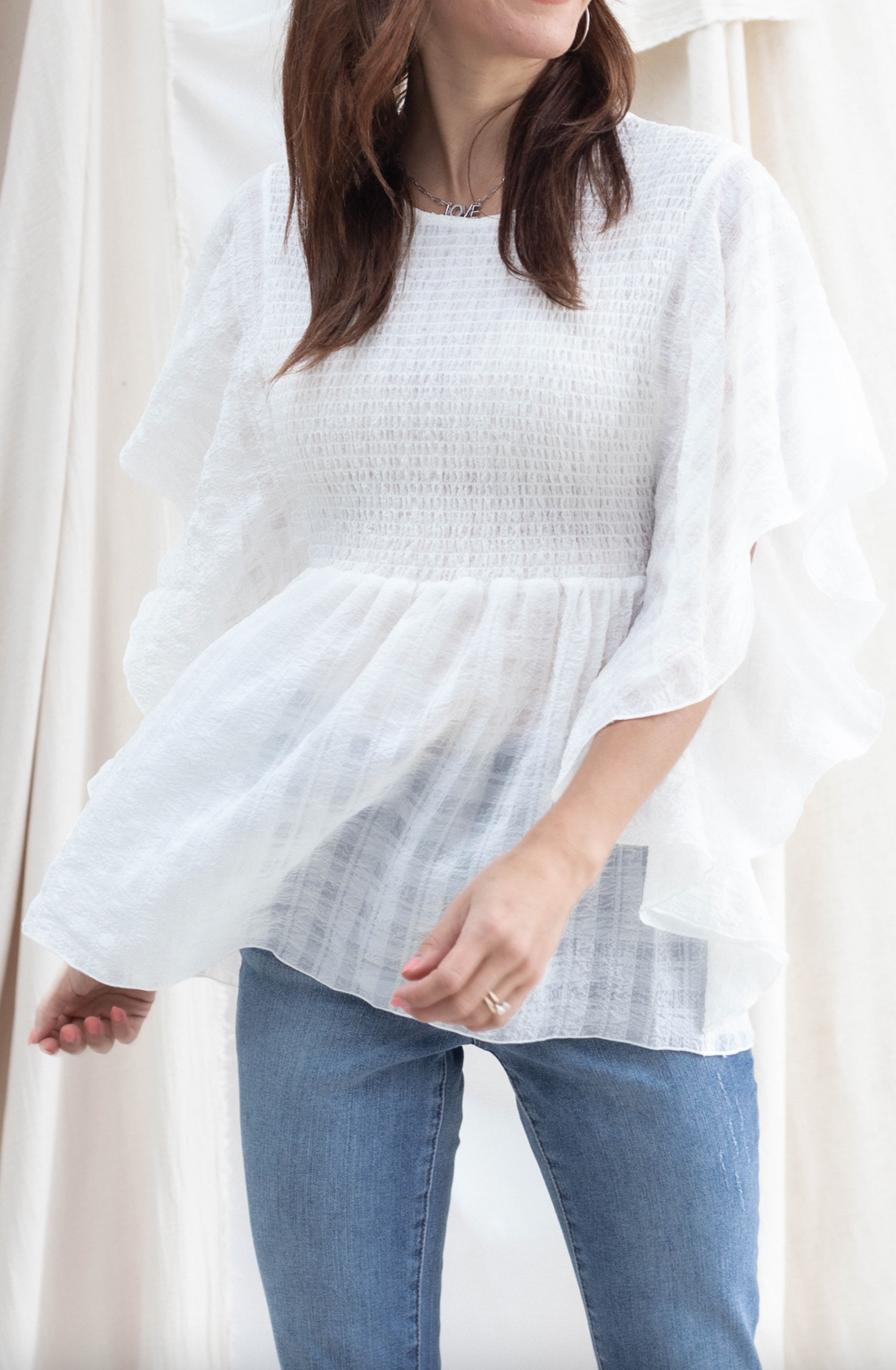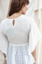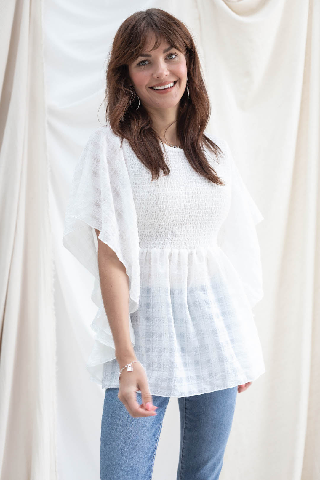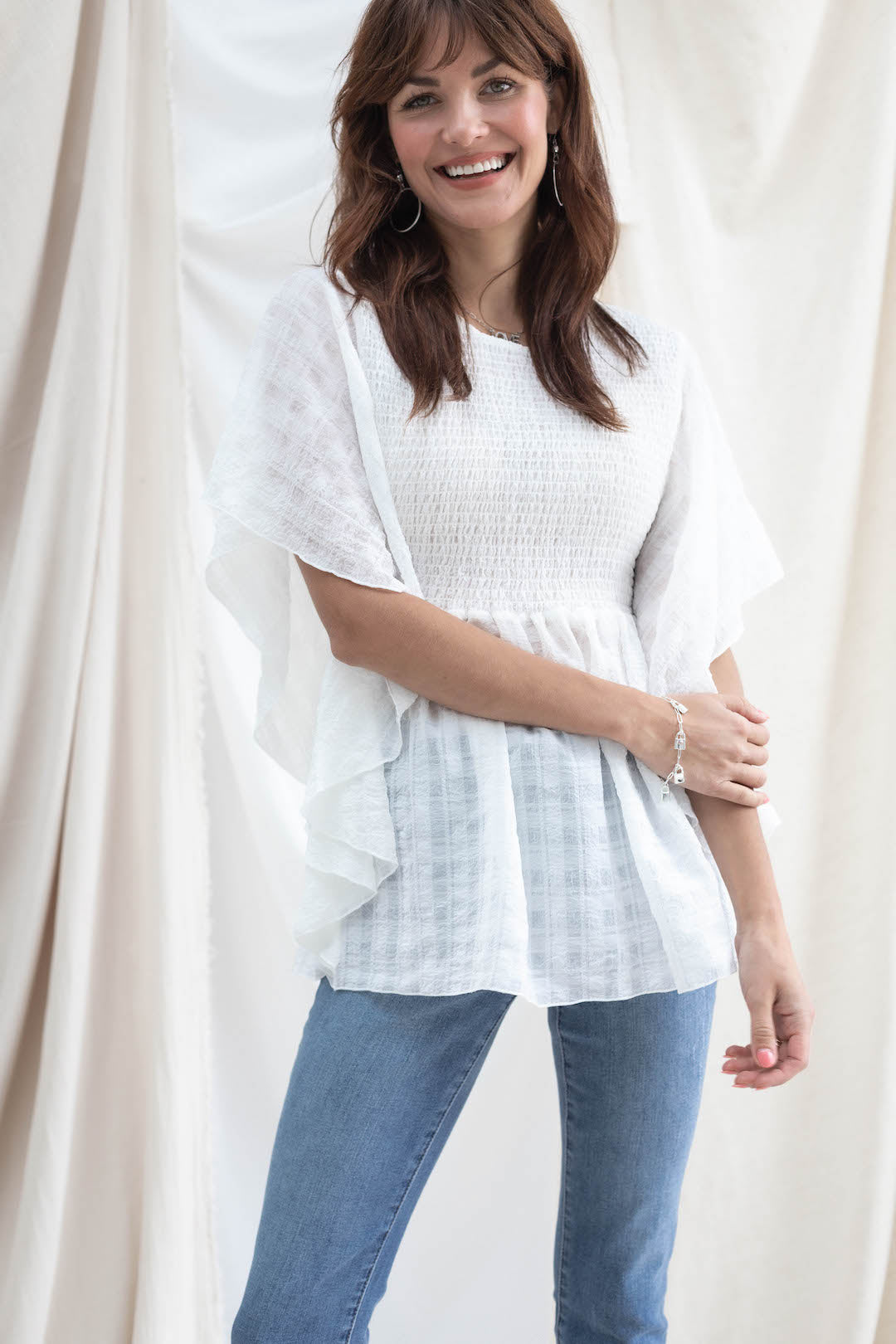 This smocked top features a subtle print in the fabric, and a strategically flattering design.