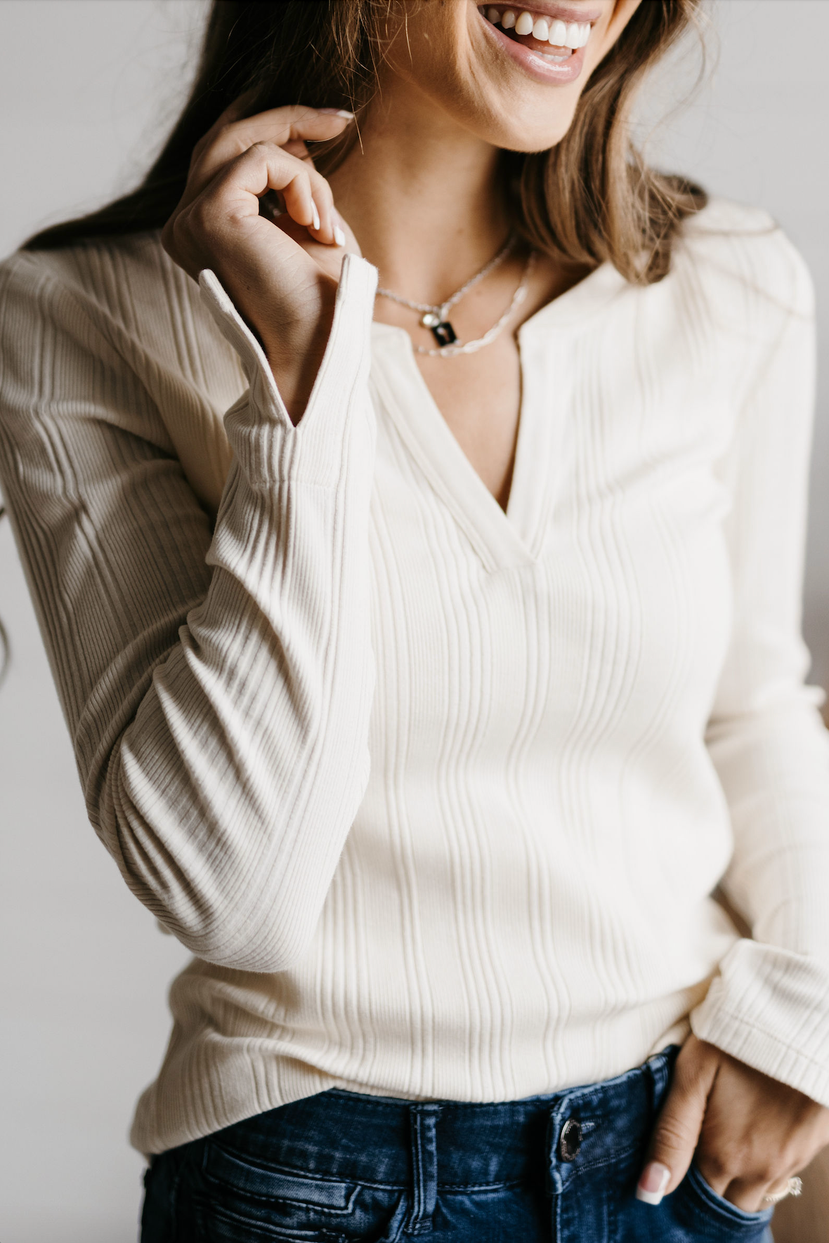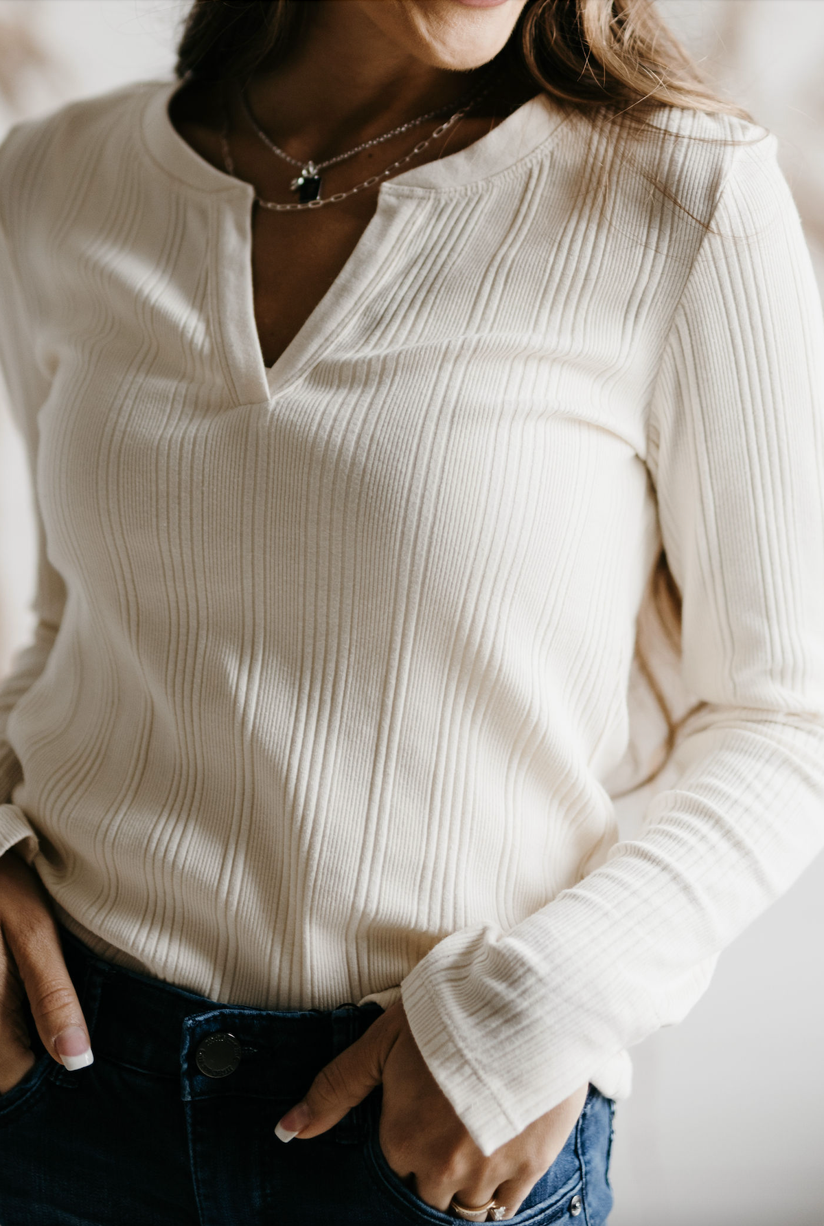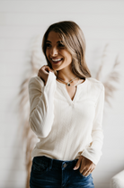 Luxuriously soft yet has some structure, a v-neck detail that is flattering on everybody, and a subtle slit cuff for an elevated twist. The variegated ribbing adds interest and makes it that much more flattering!